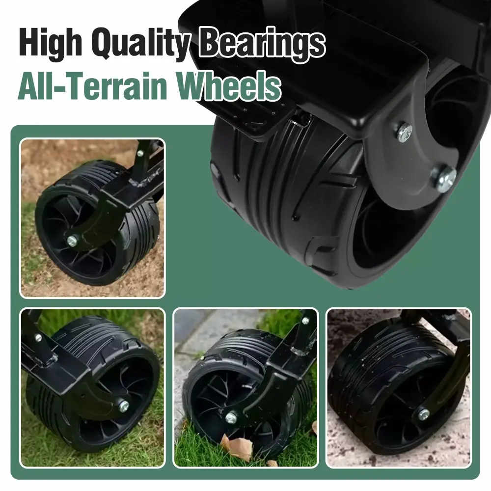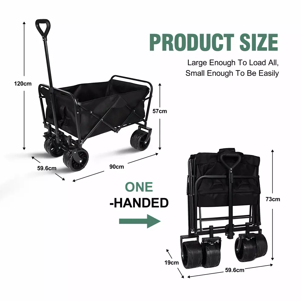 - Our folding wagon cart boasts all-terrain universal off-road wheels that are thickened and wear-resistant. making it the perfect choice for any road condition. The angle-adjustable handles provide ergonomic comfort during use. while the double brakes on the front keep the cart in place when not in use.