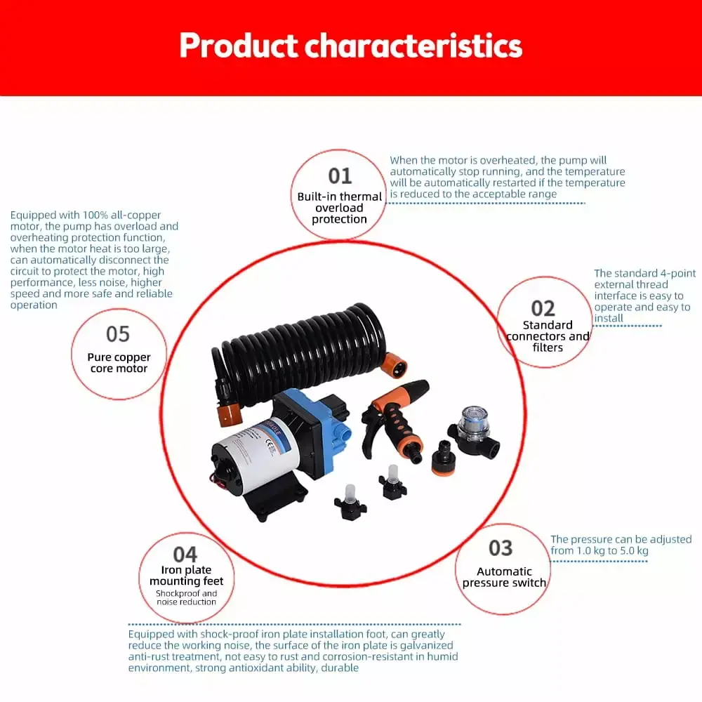 - Powerful and Versatile: Our portable cleaning pump kit includes a high-quality water pump with built-in thermal overload protection. ensuring safe and efficient operation. With a wide range of applications. it can be used for water transfer. boosting water pressure. and even as an RV water pump.