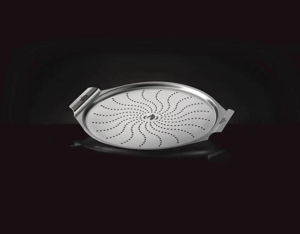 Easily bake perfect pizzas using the Napoleon 14-inch (35.5 cm) Stainless Steel Pizza Pan. The iconic WAVE™ perforation pattern provides optimal airflow resulting in evenly crisped pizza. This dishwasher reliable pan heats fast and evenly, acting like a shield to prevent burning, encouraging a thoroughly cooked pizza. The built-in accommodates allow you to safely move the pizza to and from the grill.