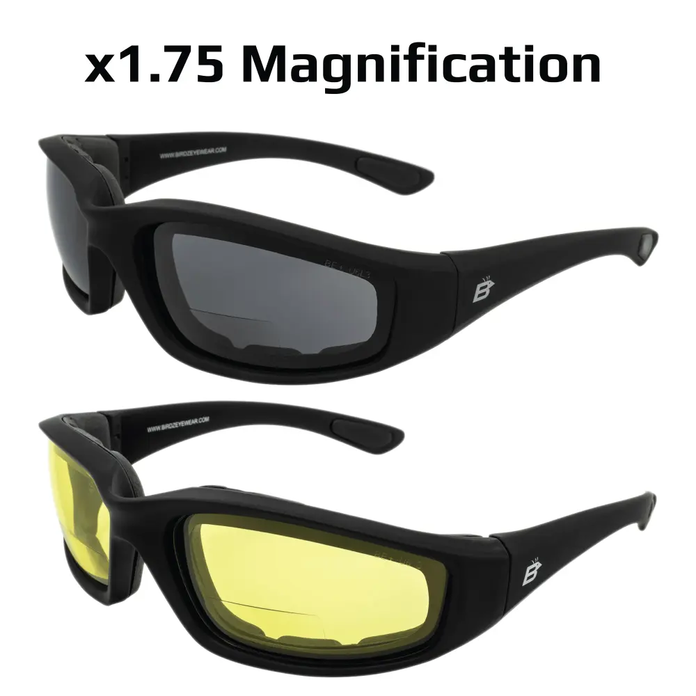 Some people may not believe it. but the truth is that you absolutely *can* improve upon perfection. Case it point Our Oriole SS series riding glasses now feature bifocal magnification. When you wear these safety sunglasses. you not only look good and remain protected. you can read the fine print while doing so. With two all-important additions of shatterproof polycarbonate lenses that meet all ANSl Z87.1+ safety standards as well as bifocal magnifications in a wide array of strengths. the Oriole has been elevated to not only fit great. protect well. and look great. it ensures safety in all conditions *and* improves your vision. Enjoy a great universal fit complete with matte black soft-touch rubberized frames for extra comfort. Our shatterproof polycarbonate lenses also feature an anti-fog coating to ensure clarity of vision. The vented EVA foam padding provides extra comfort and maximum protection from wind and debris. Glasses also come with a microfiber pouch for safe cleaning and storage. Available in clear. smoke. and yellow tint lenses. these glasses also provide bifocal vision magnification in an array of strengths. including 1.5. 1.75. 2.0 & 2.5. Fly down the road in style with high-quality protection at a great price. Perfection feels pretty good. doesnt it