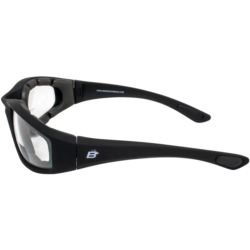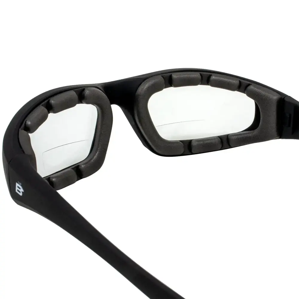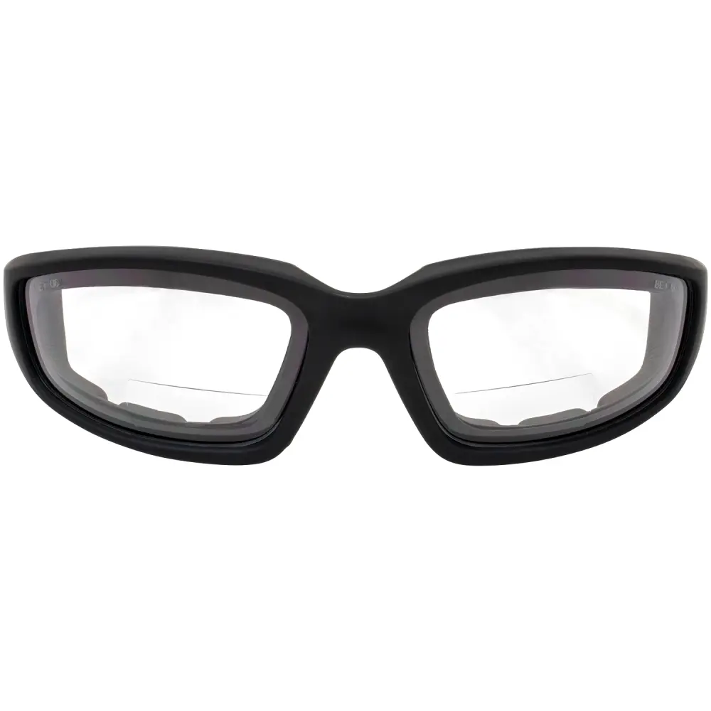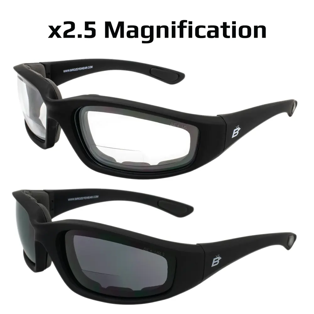 Some people may not believe it. but the truth is that you absolutely *can* improve upon perfection. Case it point Our Oriole SS series riding glasses now feature bifocal magnification. When you wear these safety sunglasses. you not only look good and remain protected. you can read the fine print while doing so. With two all-important additions of shatterproof polycarbonate lenses that meet all ANSl Z87.1+ safety standards as well as bifocal magnifications in a wide array of strengths. the Oriole has been elevated to not only fit great. protect well. and look great. it ensures safety in all conditions *and* improves your vision. Enjoy a great universal fit complete with matte black soft-touch rubberized frames for extra comfort. Our shatterproof polycarbonate lenses also feature an anti-fog coating to ensure clarity of vision. The vented EVA foam padding provides extra comfort and maximum protection from wind and debris. Glasses also come with a microfiber pouch for safe cleaning and storage. Available in clear. smoke. and yellow tint lenses. these glasses also provide bifocal vision magnification in an array of strengths. including 1.5. 1.75. 2.0 & 2.5. Fly down the road in style with high-quality protection at a great price. Perfection feels pretty good. doesnt it