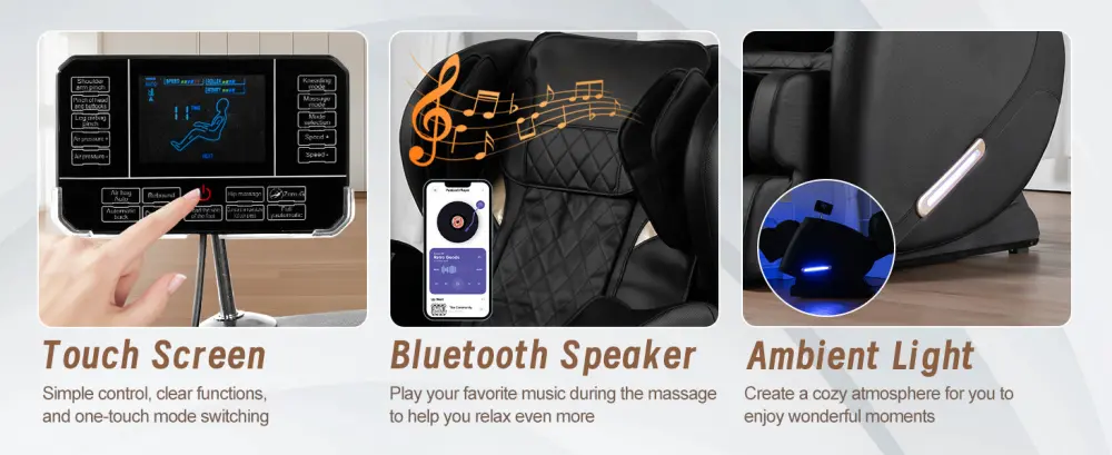 [Humanized design] The zero gravity massage chair has roller at the bottom so you can easily move around the room. With Bluetooth audio connection function, you can enjoy music while massage. Both sides are equipped with breathing blue atmosphere lights, which can make a comfortable and relaxing surroundings during the massage. The full body massage chair can accommodate up to 180 pounds and 6.1 feet tall.