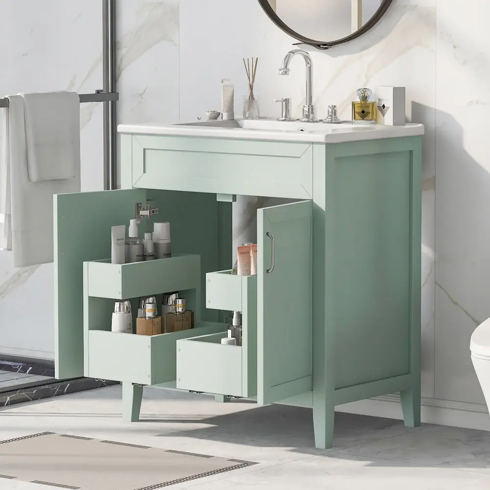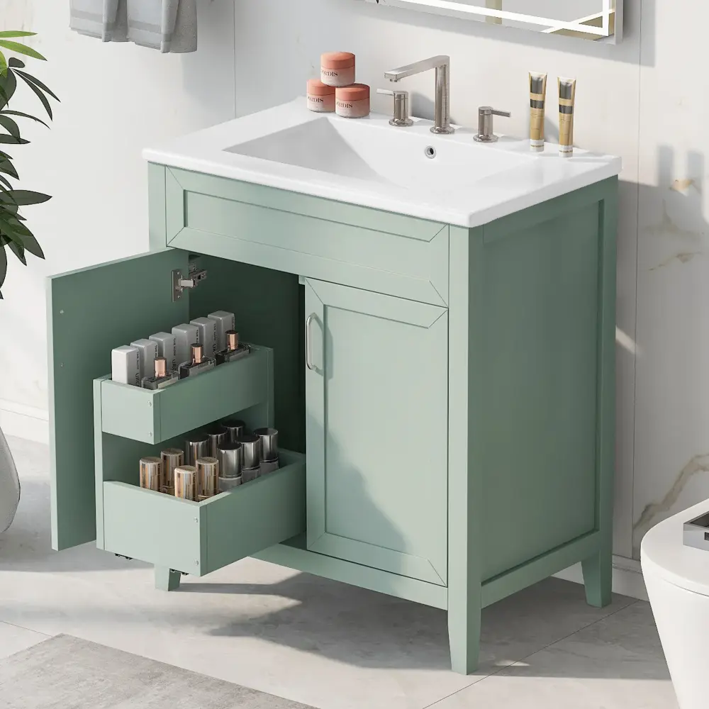 Transform your bathroom with our elegantly designed 30″ bathroom vanity, featuring a captivating green finish that brings a fresh, modern touch to your decor. This chic piece not only enhances the aesthetic of your space but also provides ample storage to keep your essentials neatly organized and within reach. Perfect for adding a sophisticated touch of elegance to any bathroom setting!
