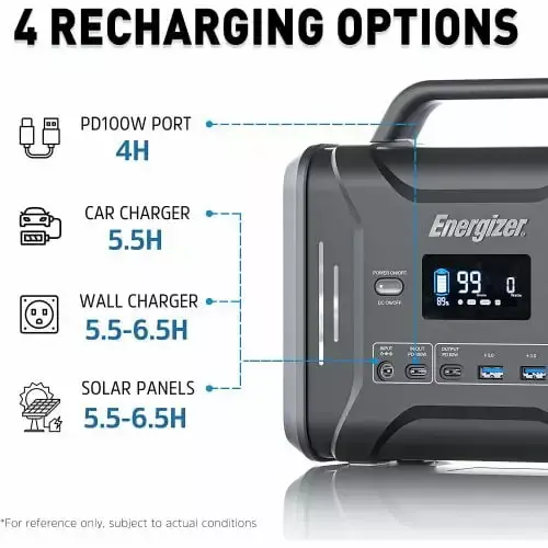 - [ Multiple DC & AC Outputs. 4 Recharging Options] – 8 output ports and sure to meet your needs for charging different devices. PPS320 with 4 charging options. Wall outlet. solar panels. car charger. PD100W port (using this charging method. fully recharged in about 4 hours)