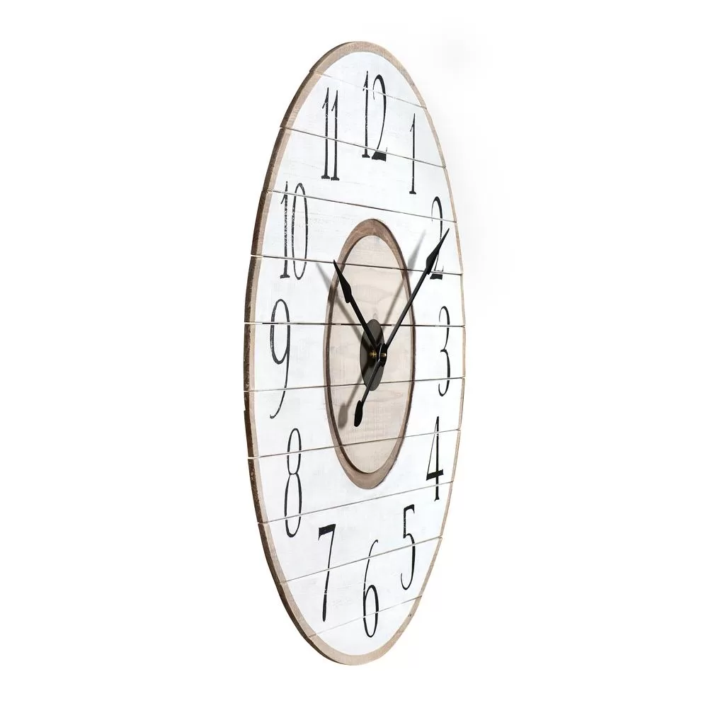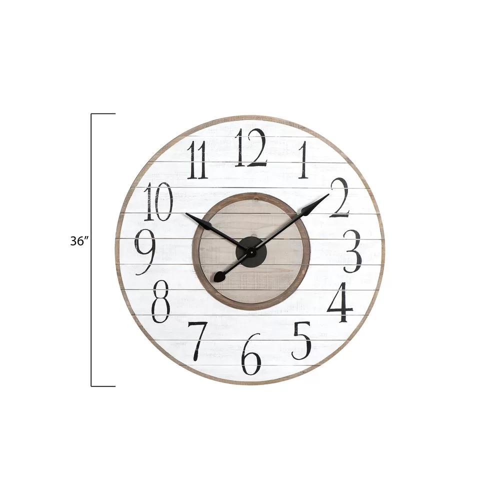 Especially fitting for an empty wall space, this 36 in. clock effortlessly draws the eye with its 3.25 in. wide wood slats and bold 5 in. high numbers. Place a black and white rug nearby and add a natural wood side table. Top off the setting with a few rustic black and white decorative pieces.