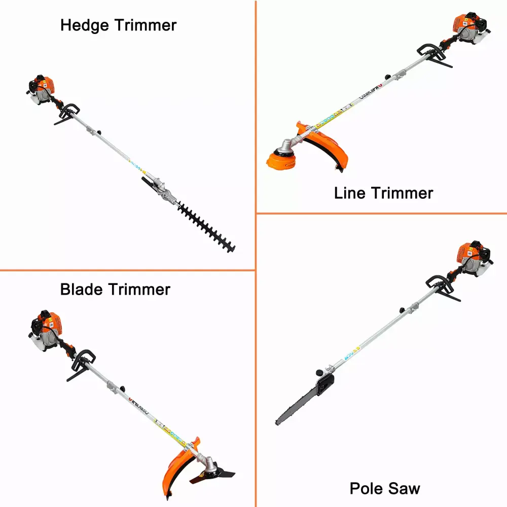 Powered by a 52CC 2-Cycle gas full crankshaft engine. the 4-in-1 multifunctional trimming tool is professional and efficient. The full crankshaft design reduces emissions. improves fuel efficiency and extends the engine service life. The starter is designed to pull easily and start quickly. and the gas power takes away your power worries. The trimmer kit includes 4 professional-grade accessories. the Pole Saw. Hedge Trimmer. Grass Trimmer. and Brush Cutter. Four tools in one purchase. great value!