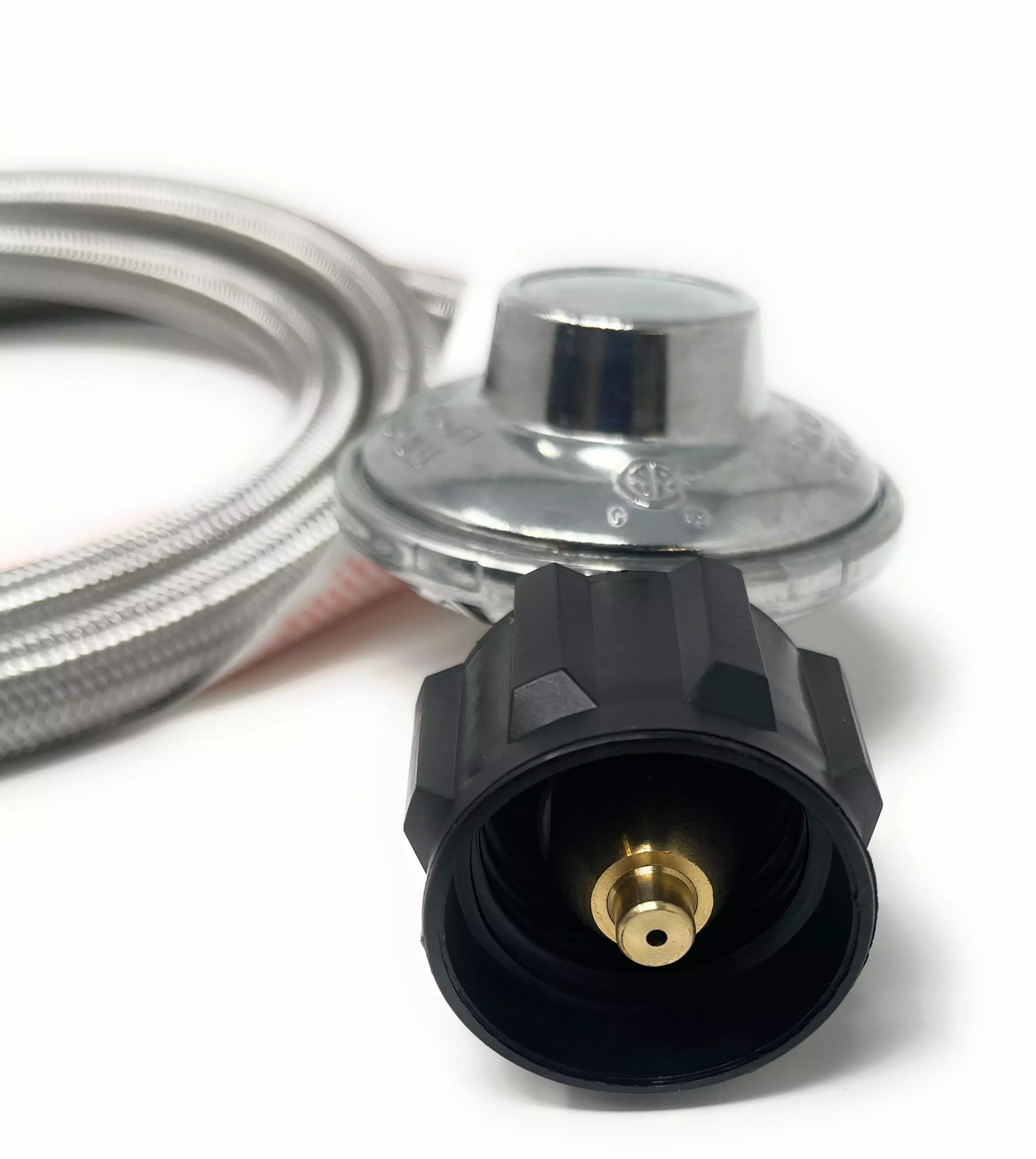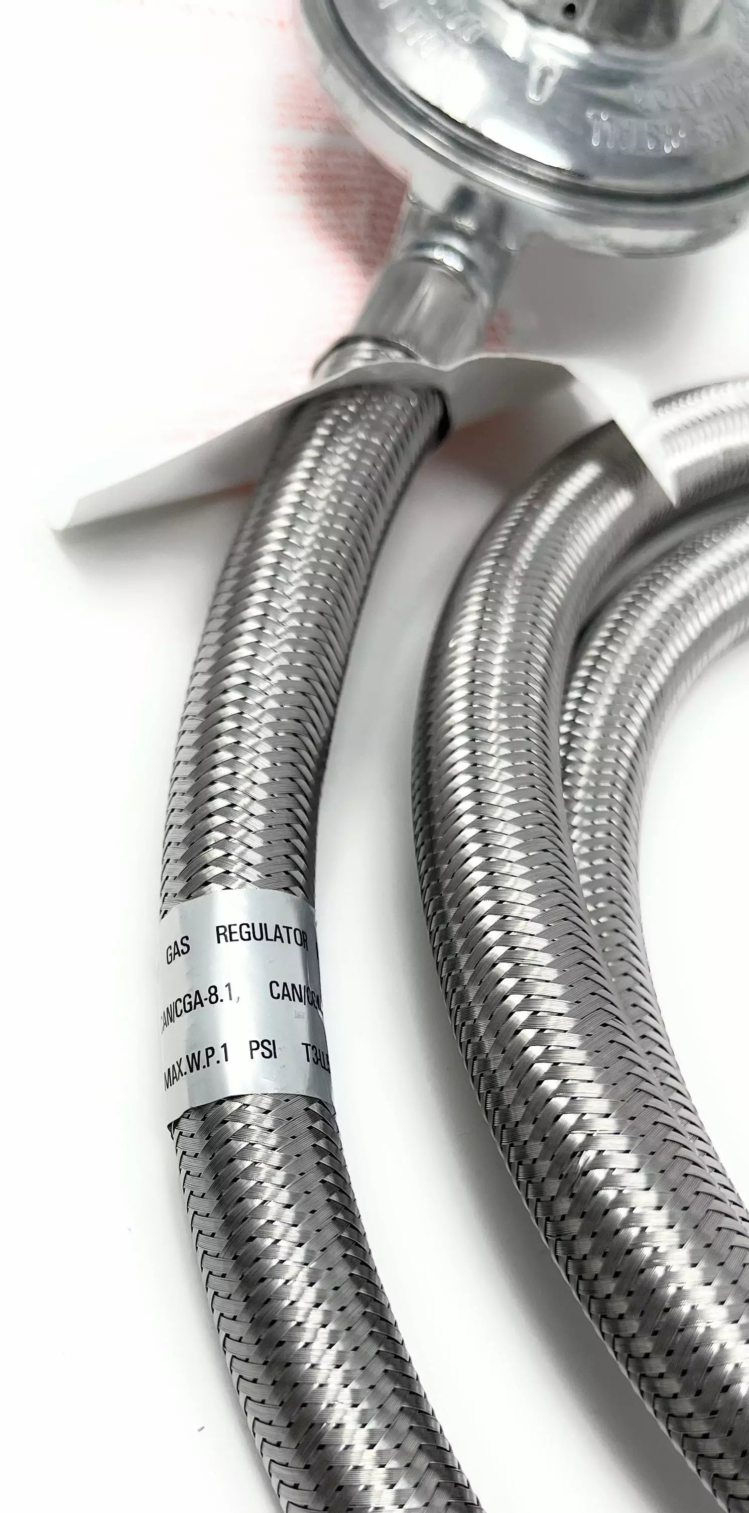 Low pressure propane hose with regulator; outlet pressure is 11"W.C(1 PSI) CSA-APPROVED: 5-FT steel braided hose; a more durable alternative than the standard rubber hose; animal chew proof. weather resistant. and UV resistant RUST PROOF CONNECTORS (QCC1/Type1 connector x 3/8 Female Flare Fitting): Long-lasting and precision-engineered connectors provide a secure. air-tight connection between your propane source and your appliances SAFE and SECURE: Quick and easy to set up COMPATIBILITY: Perfect for most LP Gas Grills. Heaters. and Fire Pit Tables
