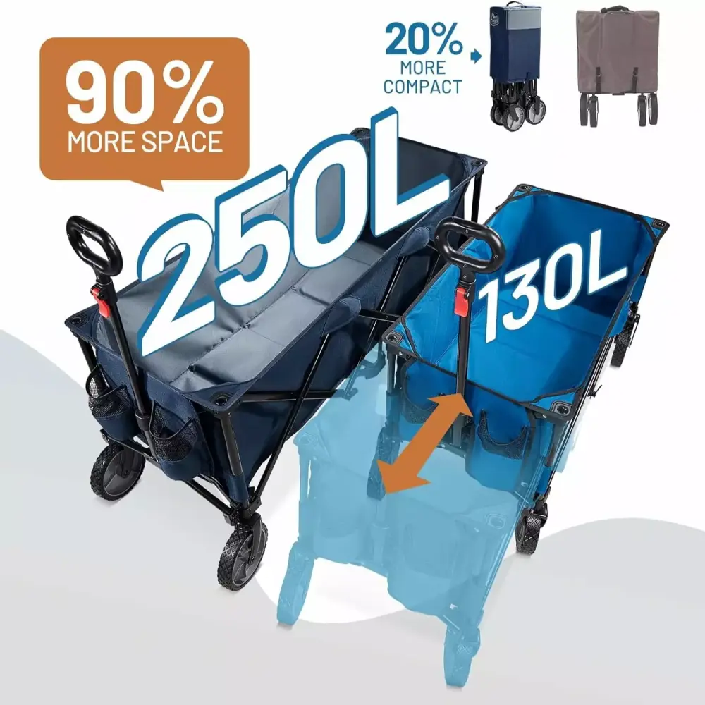 LONGER & LARGER CAPACITY Our extended wagon measures 51.2 L x 21 W x 14.4 H. providing deeper and longer storage space than the regular wagons. The maximum storage capacity is 250L/ 8.8 cubic feet. which is 90% more than others. The cart carries up to 350 lbs. and comes with side pockets and mesh water cup holders to hold all your outdoor gear at once. Attached cargo net can hold more items and increase efficiency.