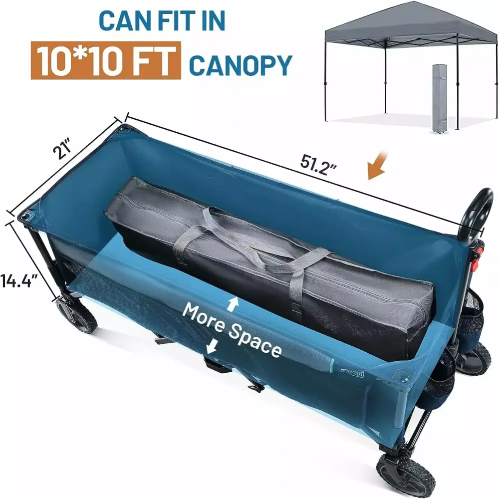 - LONGER & LARGER CAPACITY Our extended wagon measures 51.2 L x 21 W x 14.4 H. providing deeper and longer storage space than the regular wagons. The maximum storage capacity is 250L/ 8.8 cubic feet. which is 90% more than others. The cart carries up to 350 lbs. and comes with side pockets and mesh water cup holders to hold all your outdoor gear at once. Attached cargo net can hold more items and increase efficiency.