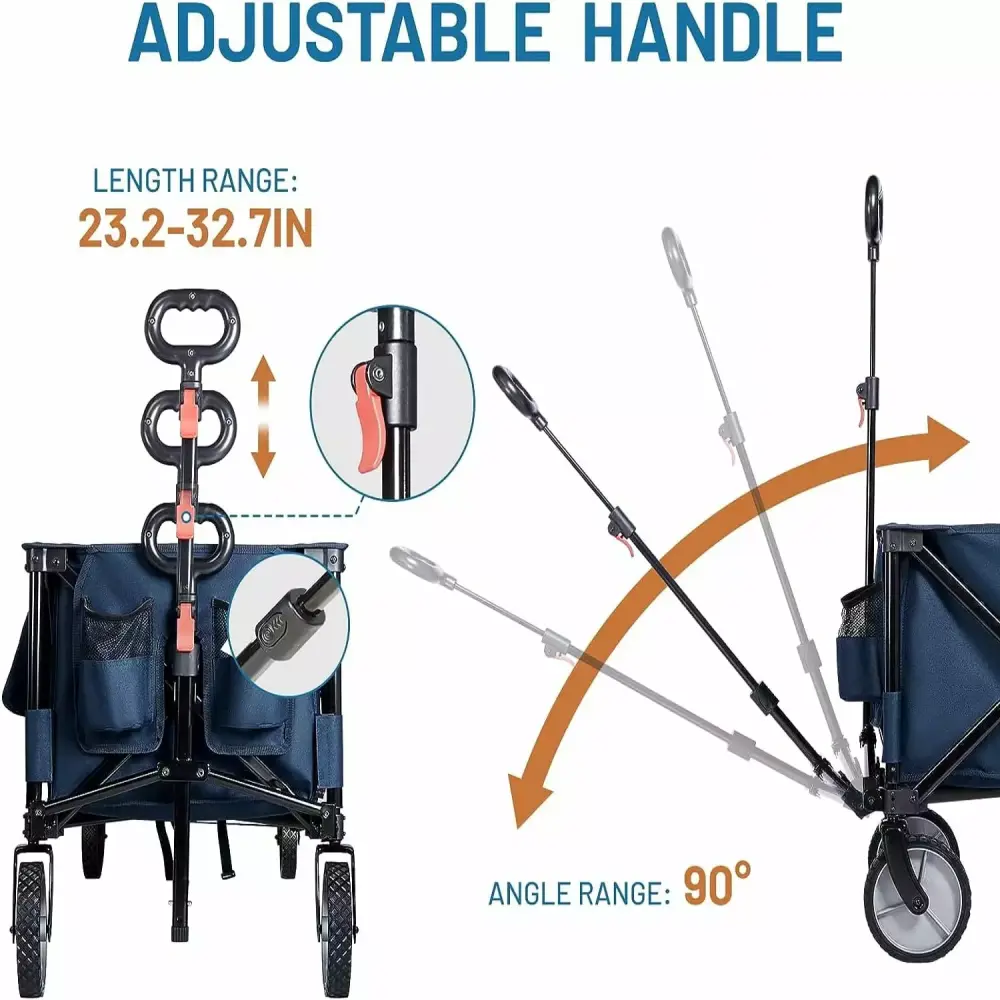ADJUSTABLE ABS HANDLE & 360 ROTATING WHEELS Ergonomically designed telescoping adjustable ABS handle for easy transportation. telescoping from 23.2-32.7 inches with a maximum angle of 90 degrees. 360 swivel anti-skid PVC front wheels for easy maneuverability. better safety and stability. The included practical storage cover can be used to keep dust out and provide better protection. Two water cup pockets on the front provide easy access to your water bottles and beverages.
