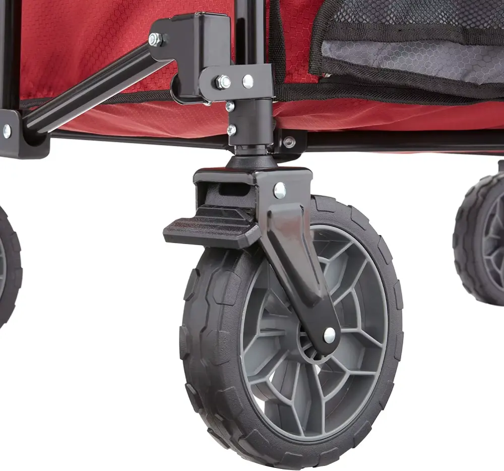 This wagon isn’t just built for sidewalks and parking lots. Grass. gravel. mud. and dirt won’t slow you down thanks to the 7 never-flat treaded tires. complete with heavy-duty lockable brakes. and concrete won’t . A center-mounted steering handle and widely spaced wheels allow tight. precise turning in narrow environments and even load-distribution.