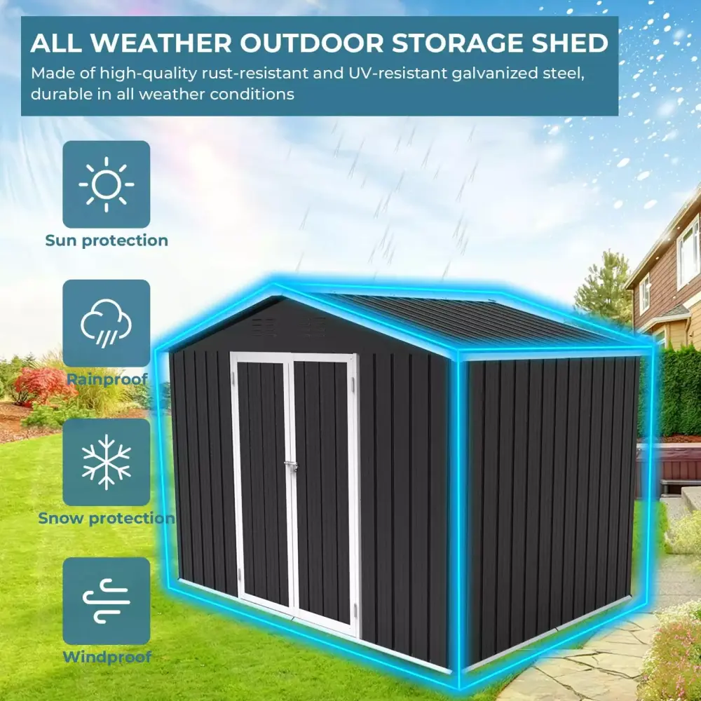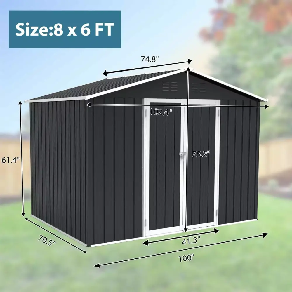 Don’t let your patio clutter. SESSLIFE Outdoor Storage Shed. 8′ x 6′ large size. easily store your multiple tools and gardening supplies; made of upgraded galvanized steel for sturdiness and durability. Superior weather resistance and water resistance will bring the best protection!