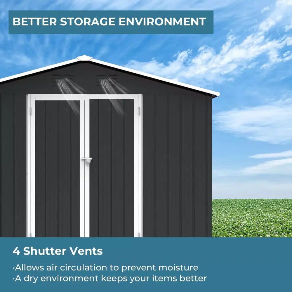 —The shed features 4 integrated perforated vents to retain the need for ventilation and prevent items from deteriorating due to sunlight.