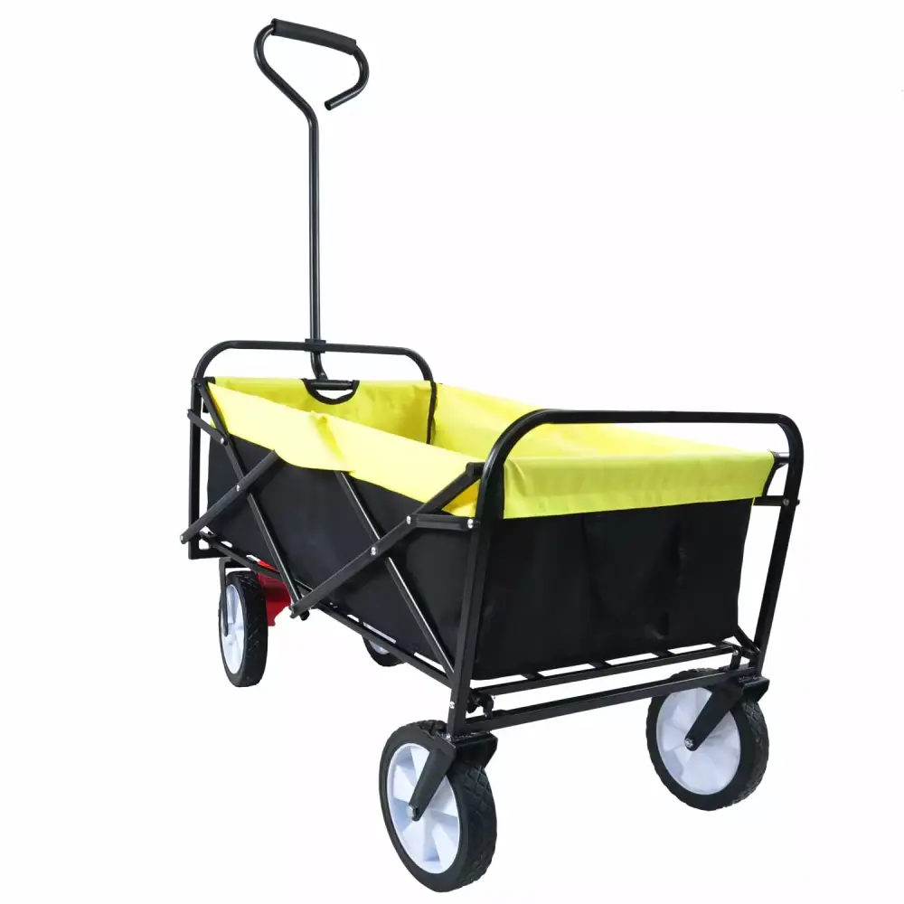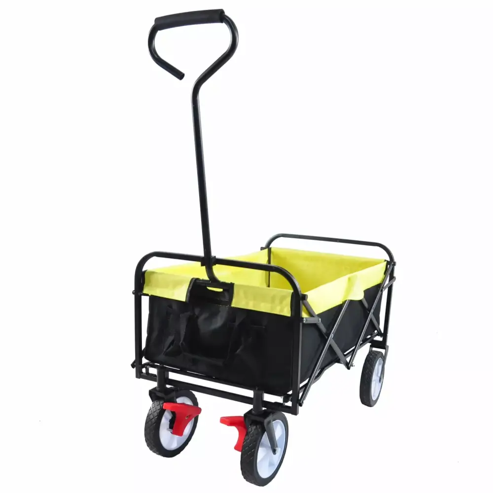 - 1. The Black and Yellow Folding Garden Shopping Beach Cart is the perfect companion for outdoor activities. picnics. and camping. Its durable wheels and retractable handle make it convenient and easy to transport all your essentials.