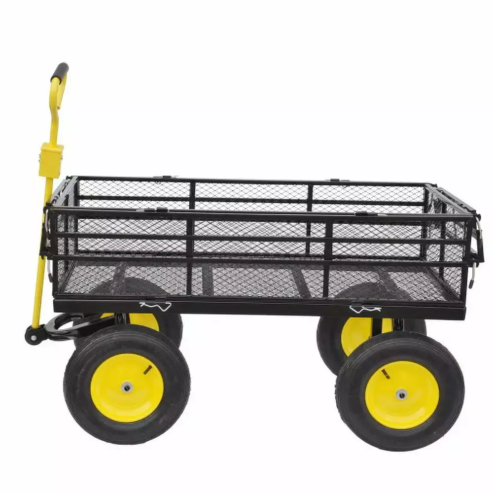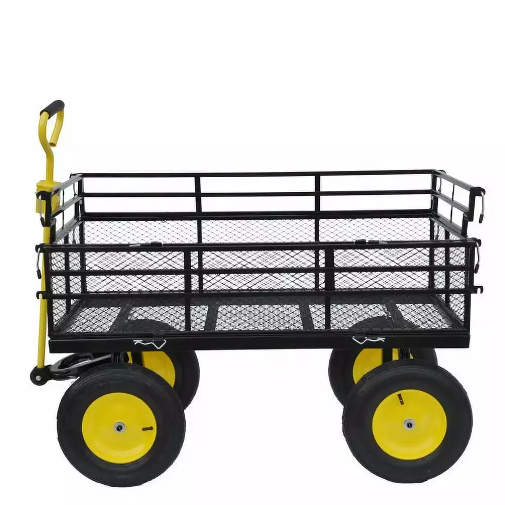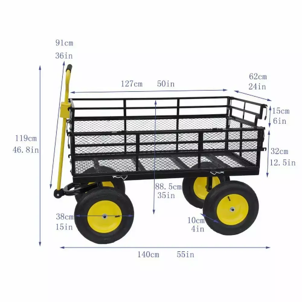 Product Features Pneumatic tires: The garden garbage truck is equipped with powerful pneumatic tires. which can easily slide on the lawn and uneven terrain to ensure that you can reach every corner of the garden. Multi-functional tool vehicle: The garden dump truck is a multi-functional tool vehicle suitable for gardening. agriculture. courtyard and home use. Spacious bed design: In addition to accommodating enough debris and farm tools. the spacious bed can also be used to transport and store fertilizers and pesticides. Large-capacity bed: The garden garbage truck adopts deep bed design. which can accommodate enough garbage and farm tools and easily complete gardening tasks. Solid materials: This utility vehicle is made of high-strength materials. Maximum static load is 1100 lbs.. so it is durable and reliable.