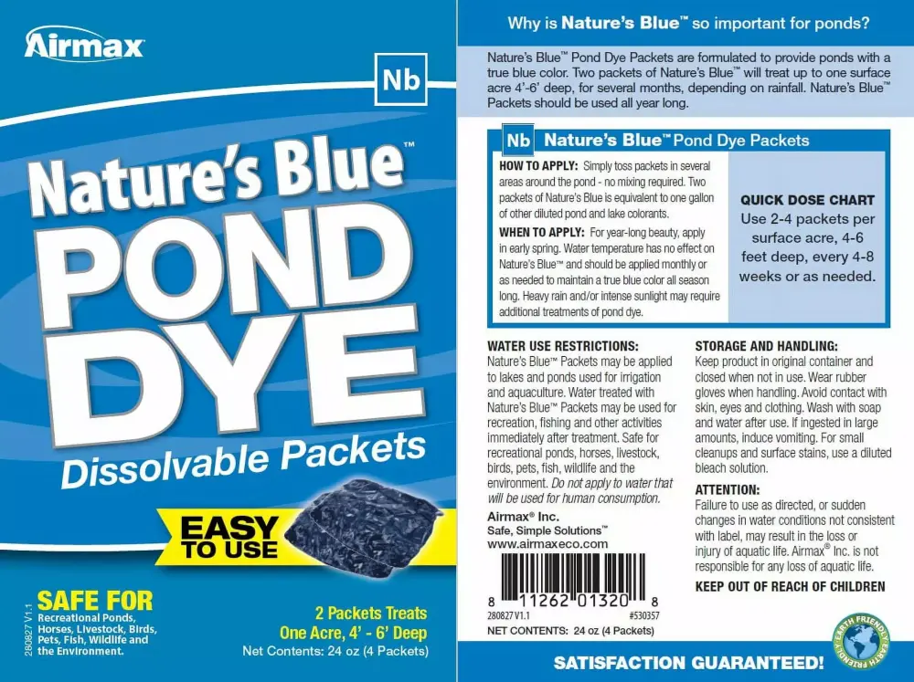 Airmax Eco-Systems was built on one simple philosophy To Make Pond Care Simple. Our staff has years of experience so you don’t have to. Although the products we manufacture are of the finest quality. we understand that our service and technical expertise must consistently surpass our customer’s expectations. 100% Satisfaction Guarantee: All the products we manufacture have been thoroughly tested to ensure their performance. longevity and effectiveness. With this said you are the finial judge. if you are not completely satisfied Airmax and it’s authorized dealers will do whatever it takes to ensure your complete satisfaction. Our concentrated formula allows 2 water soluble packets of Pond Logic Pond Dye to treat like a gallon of competitive liquid dye. Convenient. water soluble packets make treating your pond a breeze. There’s no need to cut. tear. scoop or pour Pond Logic Pond Dye Packets. just throw the packets in your pond and let your water do the rest. Pond Logic Pond Dye is a completely natural product. When used in accordance with label directions pond dye is completely safe for your fish. plants. pets and pond wildlife.
