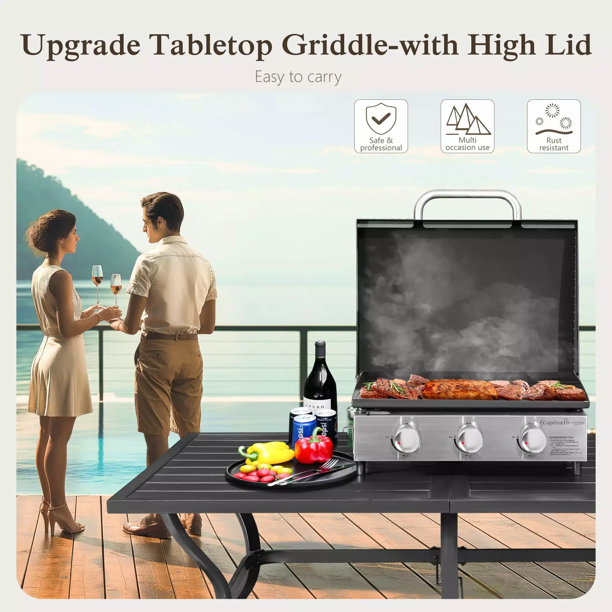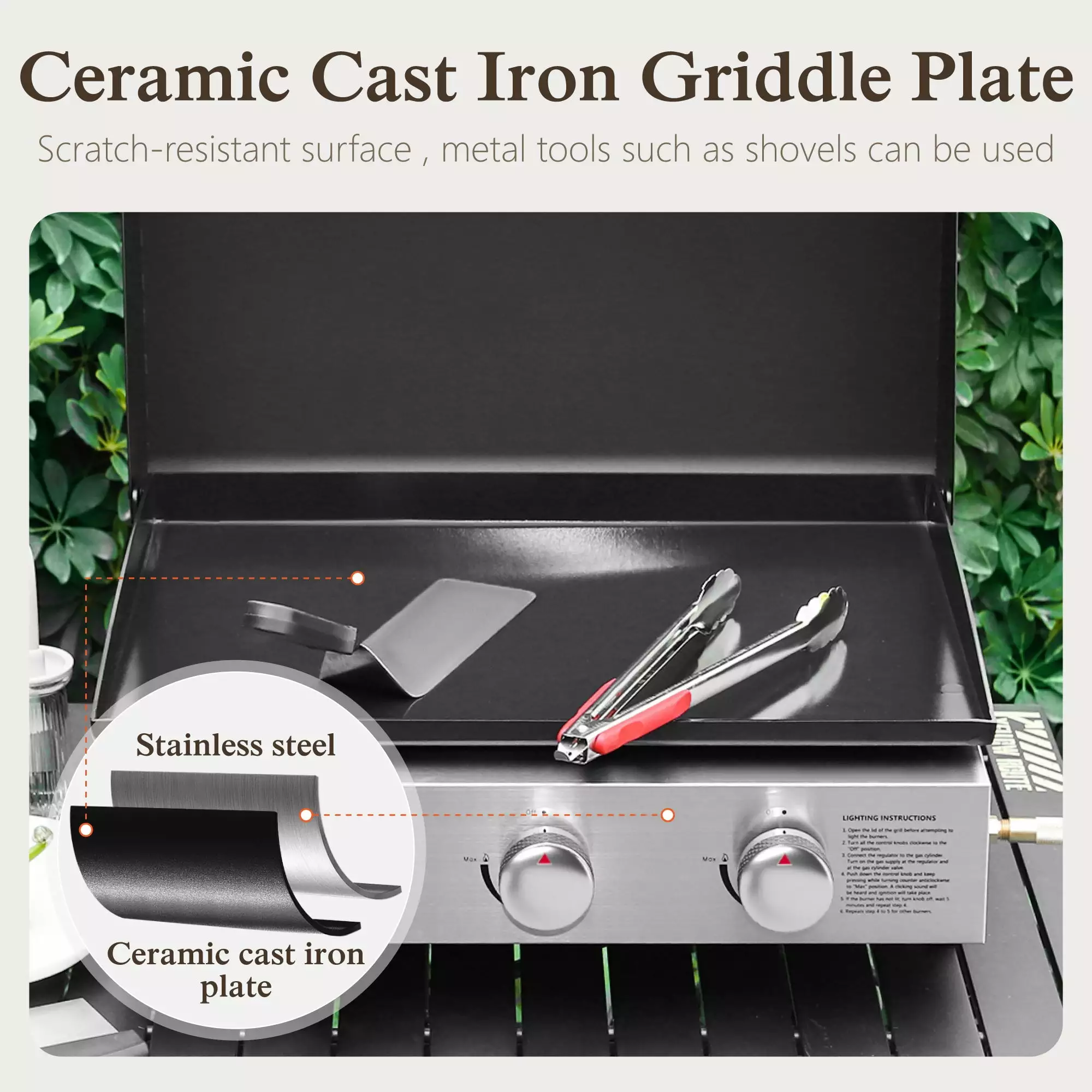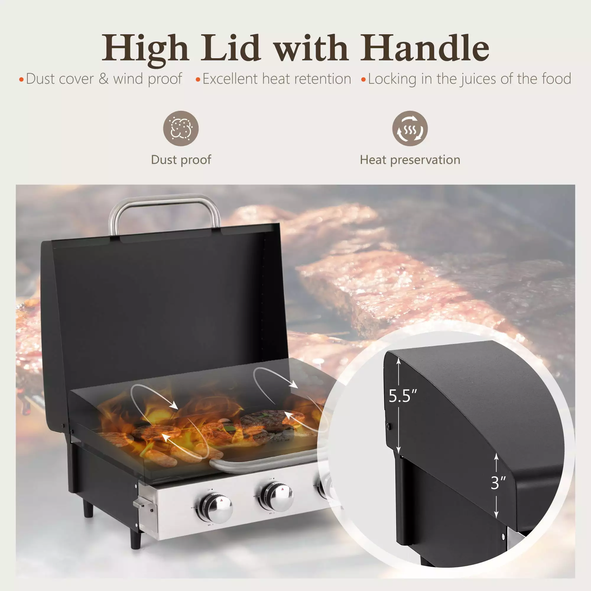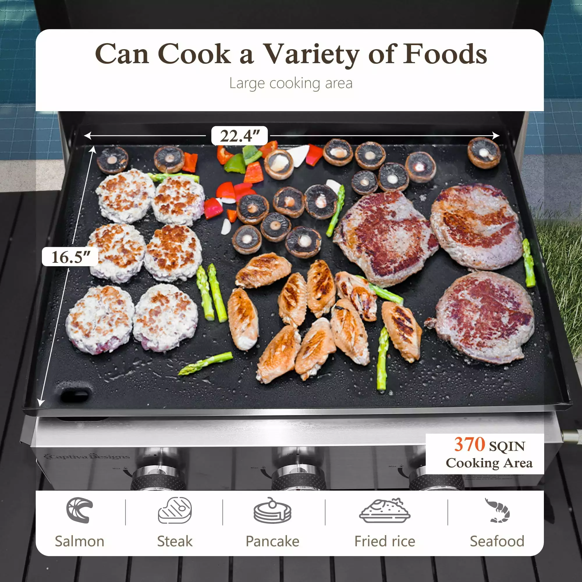 This Alpha Joy 3-Burners Gas Griddle is the perferct for breakfast. lunch and dinner. Featuring 24.000 BTU in 3 independently adjustable heat zones for a easily heat control. You can connect this barbecue to a 20 LBS propane tank or a 1 LB cylinder. No need to purchase additional accessories for backyard or camping use. Additionaly. a rear grease trap that collects all the mess and makes after-cooking clean up a breeze. This ceramic coating girddle will surely make your outdoor cooking more convenient.