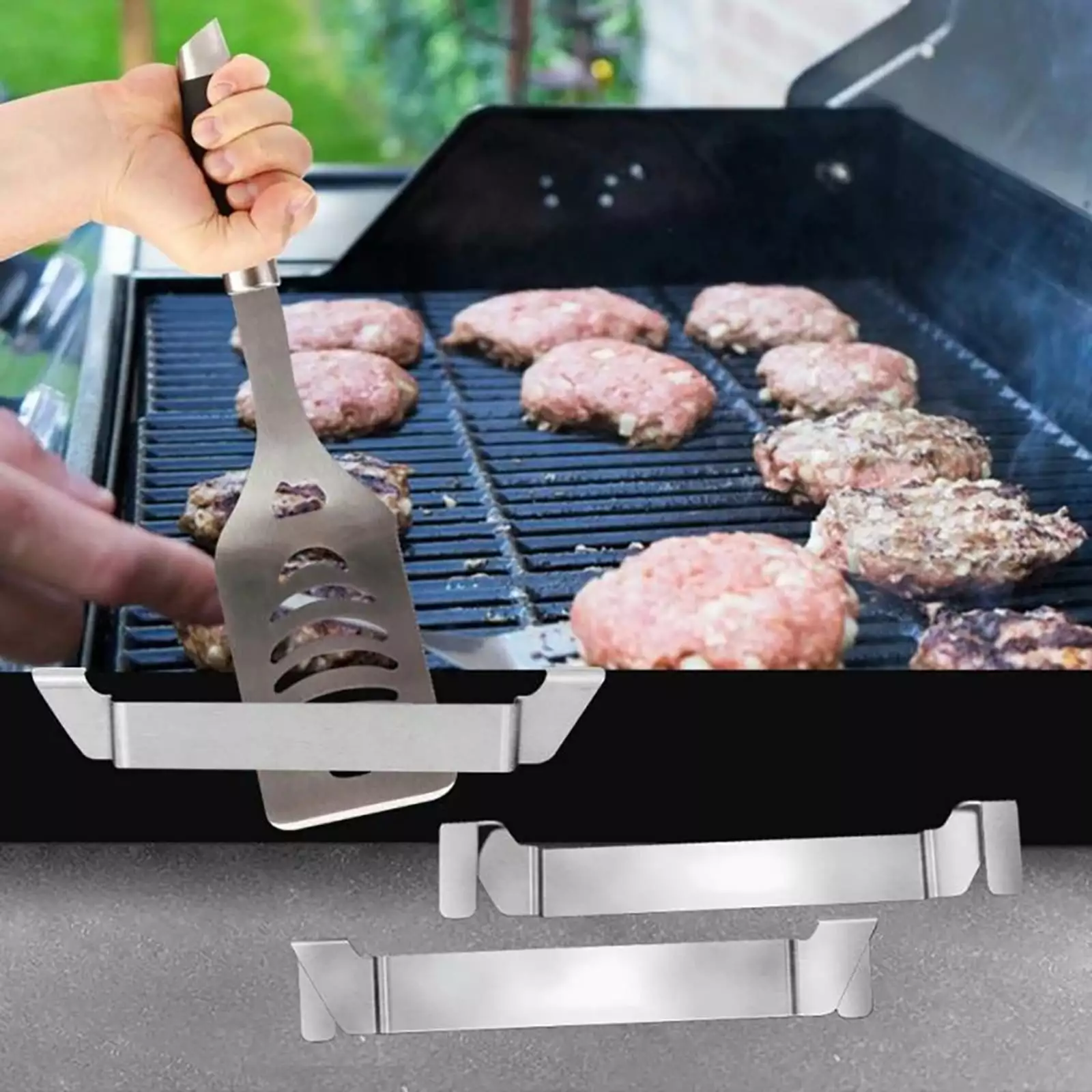 *Widely Applicable The grill spatula holder can be used most types of frying pan grills on the market to hold long spatulas. slotted spatulas. grill scrapers. fish turners. etc. Great for outdoor camping picnic grilling! Warm tip Before purchasing. please confirm whether your grill griddle is suitable for this tool.