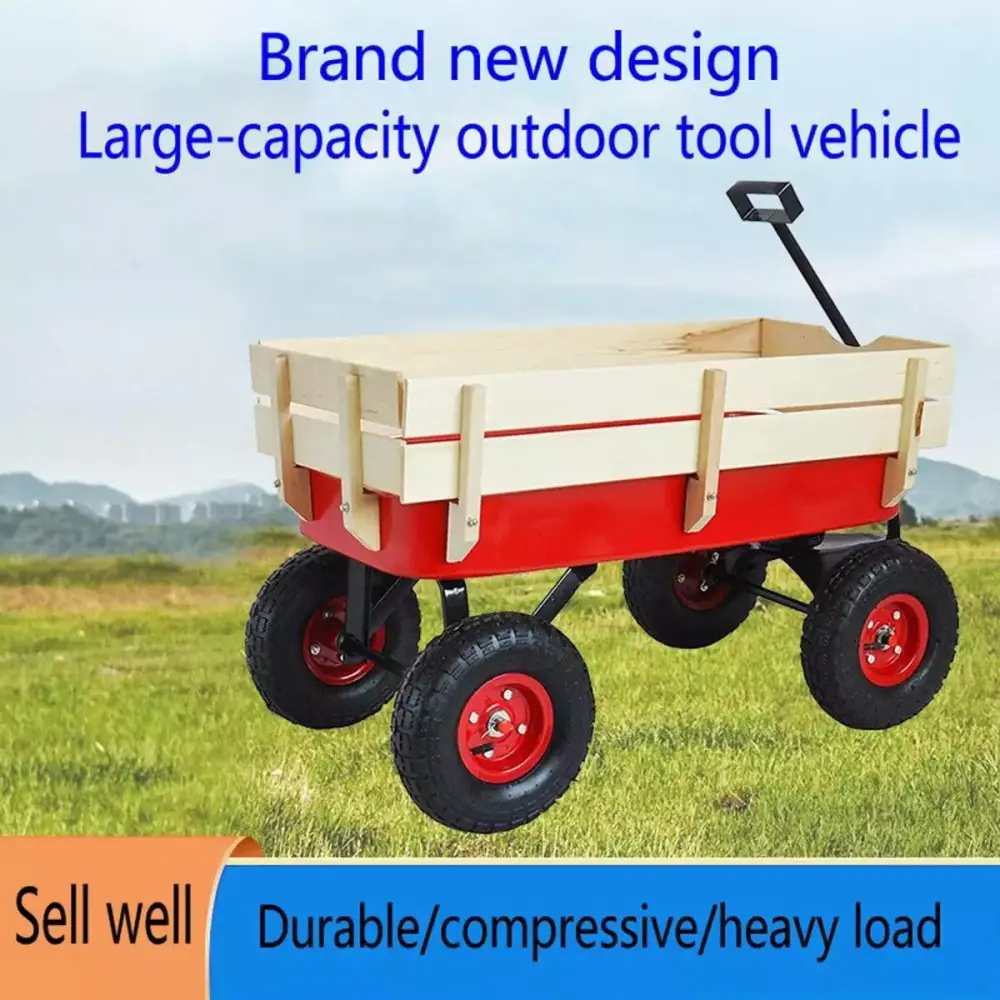This big foot panel wagon has an all-steel construction. rugged air tires and wooden stake sides. which is great for your kids or grandkids to play with. The wagon can haul gardening tools or supplies in the yard! It has a large loading capacity of 176lbs. The extra-long handle is foldable under for easy storage. The wooden panels in the side are removable.