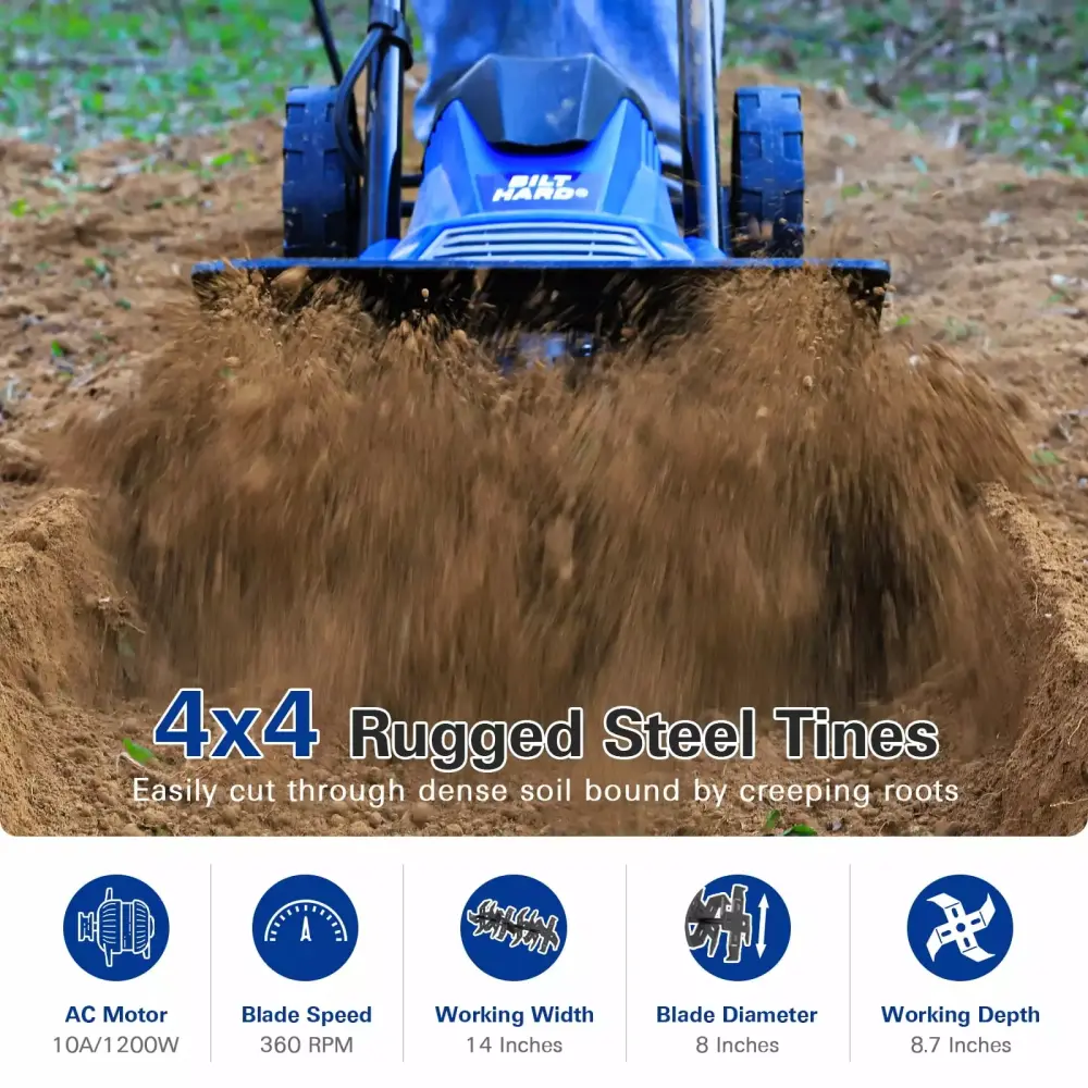 BILT HARD Tiller Cultivator 14 inch. 10 Amp 4 Steel Tines Electric Garden Rototiller with Adjustable Wheels