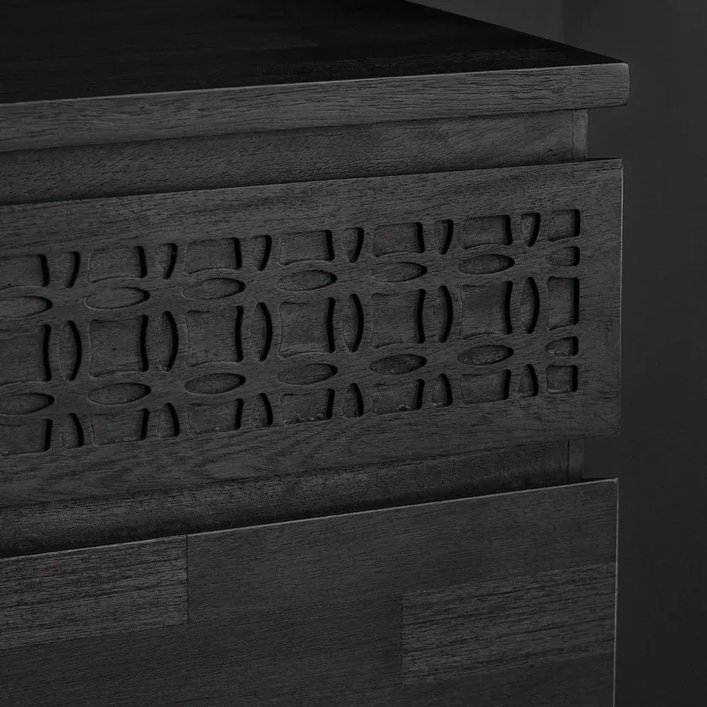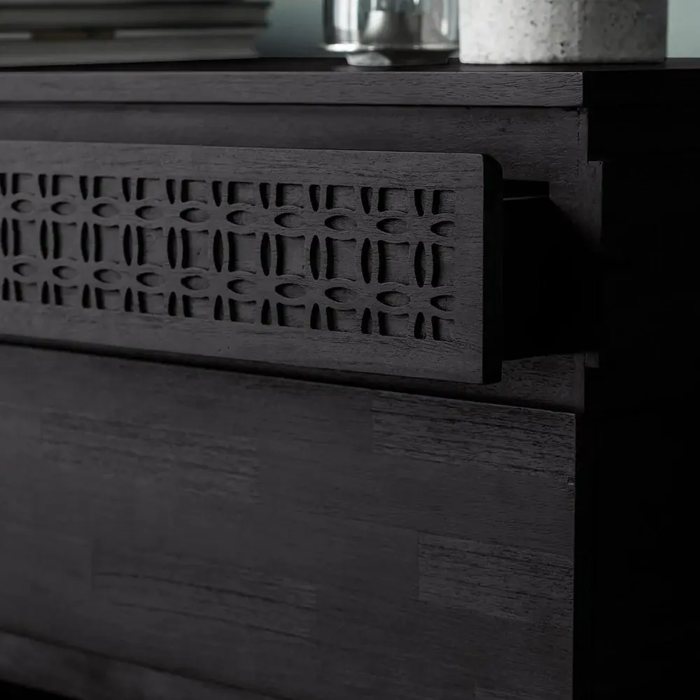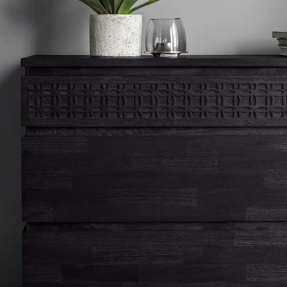 This 4 Drawer Chest is made using Mango solids with mixed timber veneers of Teak-Mahogany-Mindy Ash and Mango which give contrast and make the inlaid pattern stand out. It has a stunning mat black charcoal finish – the different grains in the mixed timbers stand out in the light and catch your eye with this beautiful detail.nnThe chest provides a patterned frieze of blind fret work along the front of the top drawer, made from well-built mango wood.nnOffering a global traveller look that has a hint of ethnic design detail, this beautiful chest of drawers is exciting but timeless in its approach and so can be mixed with modern or classic pieces in an eclectic living space.