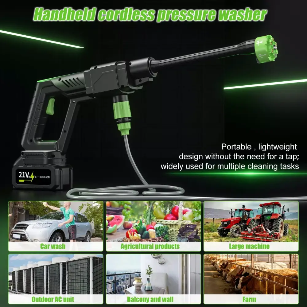 - 6-in-1 Adjustable Nozzles: The cordless pressure washer has 0-180 degree rotating nozzle to meet different situations. 6-in-1 spray nozzle for 0 degree. 15 degree. 25 degree. 40 degree. shower mode and water flow mode allows you to adjust the water so you can switch any spray pattern you want without changing nozzles. Ideal for various daily DIY projects like clean cars. bicycles. or siding. floor. swimming. pools. garden. furniture. windows. terraces. even watering plants. pet bathing. etc.