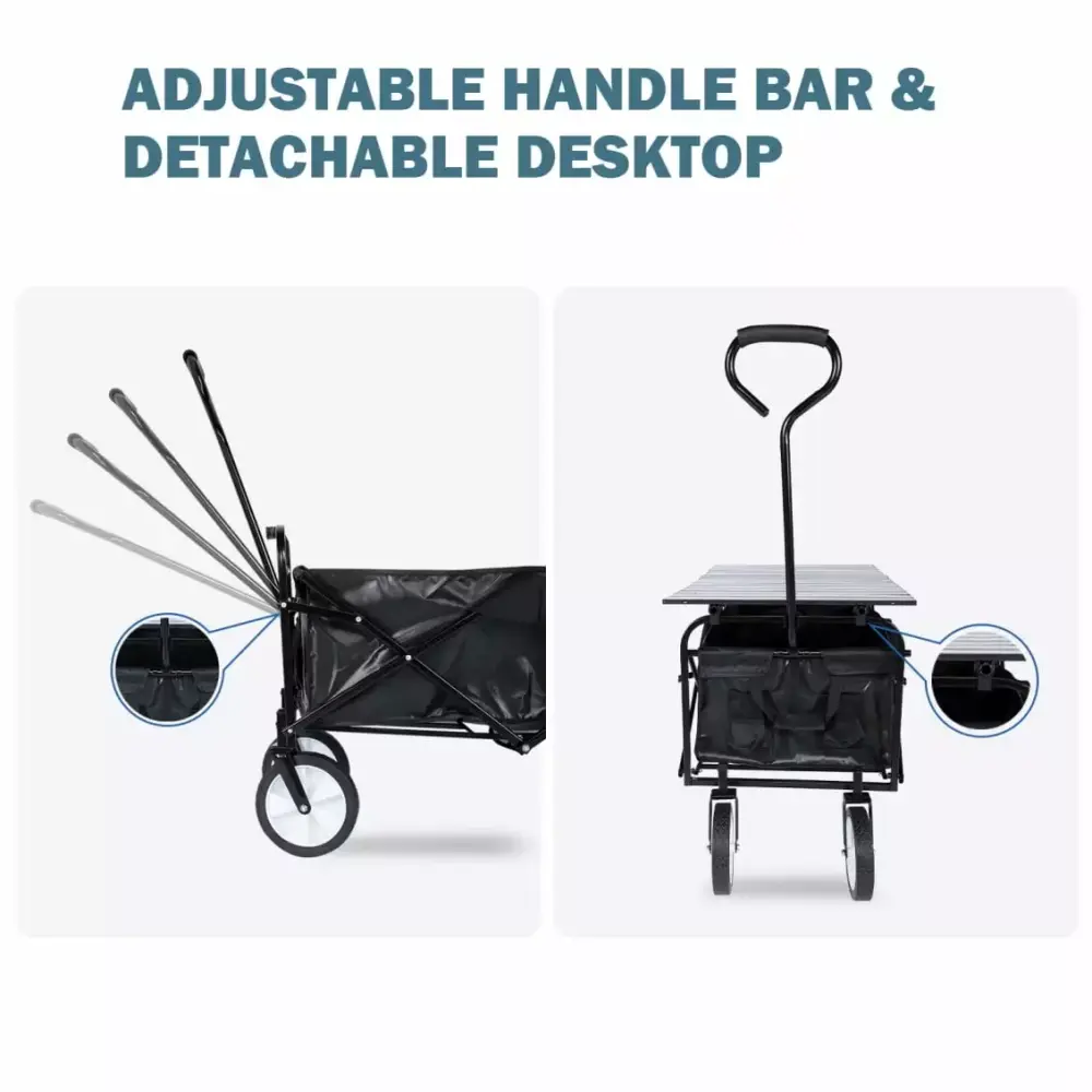 Constructed with high-quality steel and Oxford fabric. this foldable camping cart is easy to fold and unfold in seconds. It is perfect for camping trips or shopping with its adjustable handle and ability to transport heavy loads of up to 167 lbs. This wagon cart has a grid aluminum alloy desktop. measuring 35.4 21.7”. This grocery utility wagon is designed to be thinner. lighter. and more portable.
