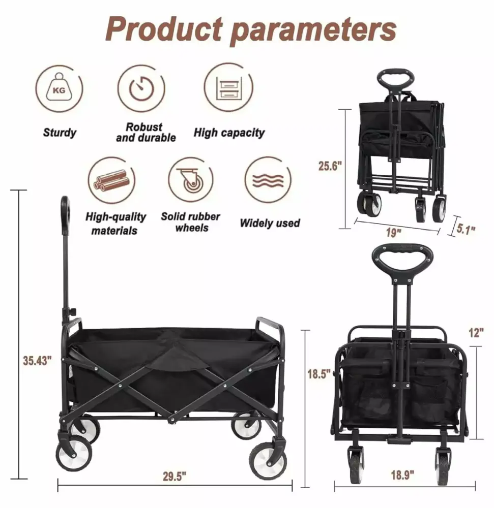 - [ADJUSTABLE HANDLE] The handle length of this folding garden cart can be extended from 26 to 35.4. The angle also can rotate smoothly as you need. The handle locks in place with a joint so no need to worry about it drops or the cart out-of-control.