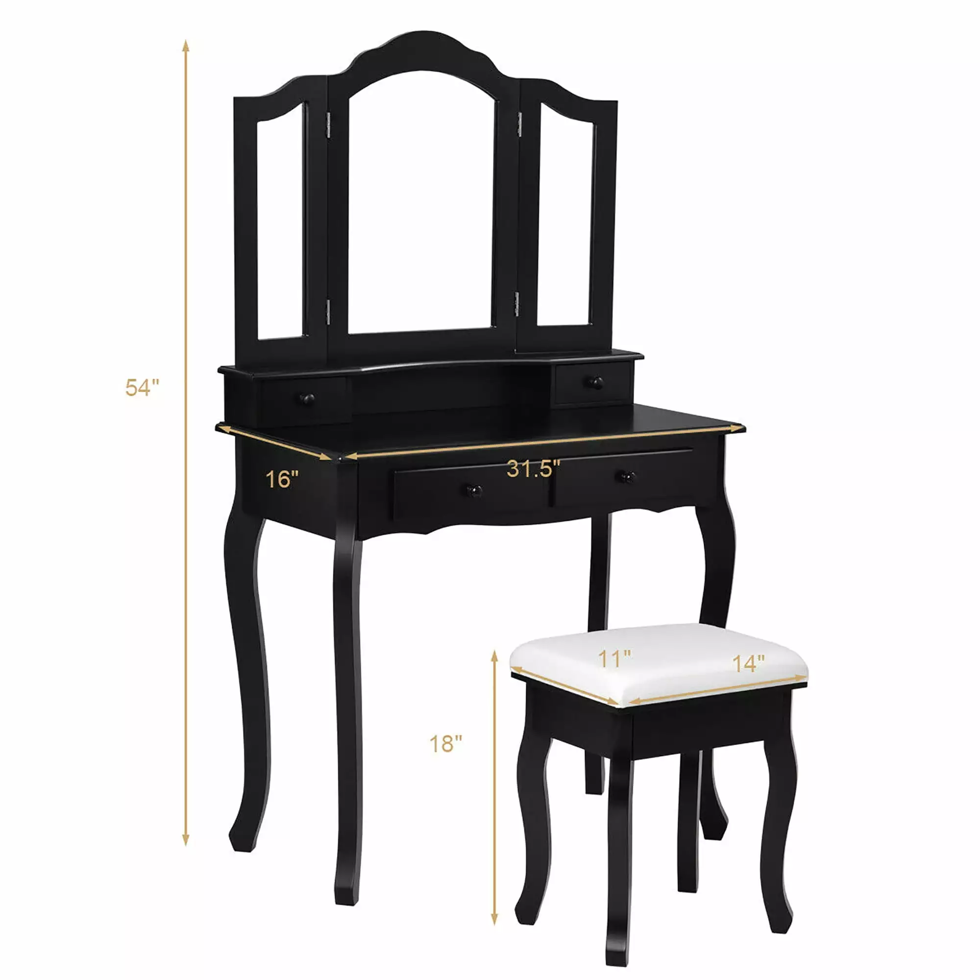 Are you looking for forward to owning a wonderful dressing table set Come and have a look at our glamorous dressing table set! It will be a fantastic product that let you realize your princess dream. It is in classic black color. which makes it look compact. It can be a fine display of your room. This dressing table set includes a mirrored dressing table with four drawers and a stool. One of the biggest characteristic of this dressing table set is that it has a tri-folding mirror. two 180 folding mirror and a center mirror help you view your face or hair from multiple angles. You can well make yourself up in front of them. And the stool has a really comfortable top. When you are sitting on it and dressing yourself. you will feel that it’s really an enjoyment. The table with mirror and drawers is of great value. A lot of things can be stored in the four storage drawers and the spacious table top. For example. your makeup. jewelries. accessories. ornaments and other things. Made of wood and MDF. our product is stable and can serve you for a long time. What a perfect dressing table set! Don’t hesitate! Come and buy one!