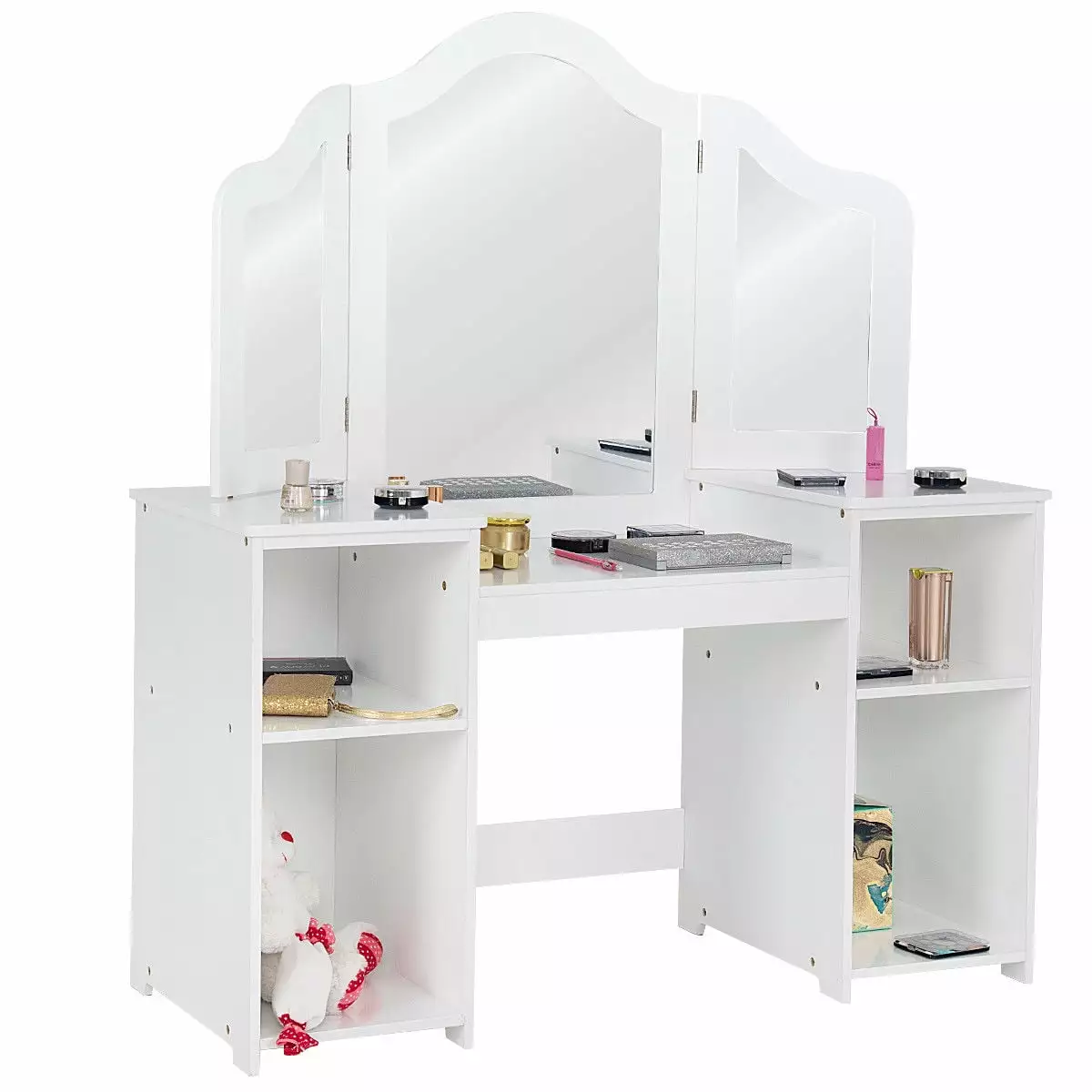 le is a multi-functional dressing table tailored for children which gives your kids a funky place and more chance to become beautiful. The child vanity table is suitable for children over three years old. With the three-panel mirrors design of the dresser. your children can find the perfect angle. make up from multiple angles and get a better reflection. There are four storage compartments under the dressing table surface for children to store books. toys and daily necessities. When your kids are using the vanity table. you didn’t need to afraid they would be bumping or scratched because the round corner of the table is designed to reduce potential safety hazards for children. This kind of white vanity table can match the chair of all colors and styles. you can choose chair to use casually. Such a safe and affordable versatile makeup desk can meet your makeup. learning and storage table and storage.