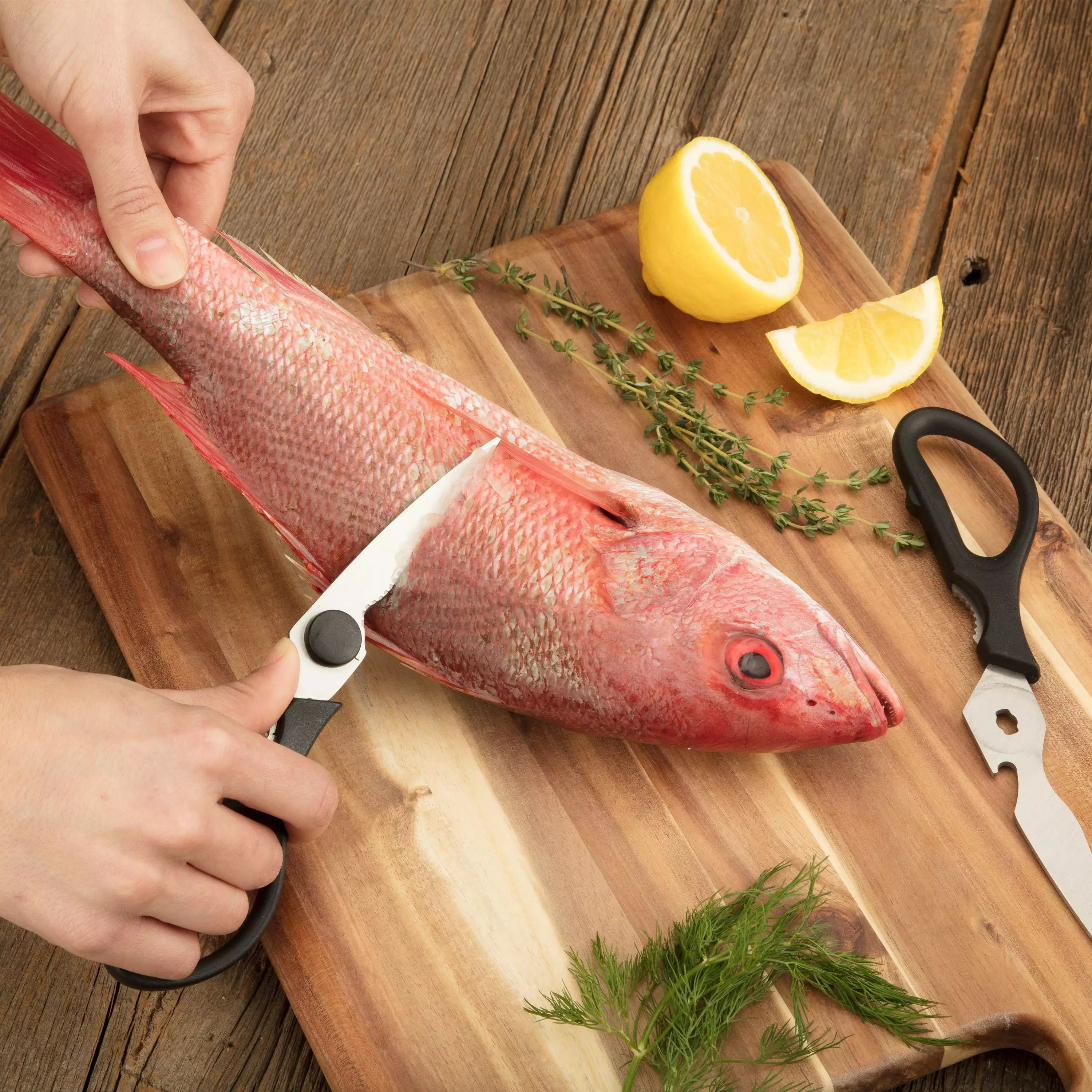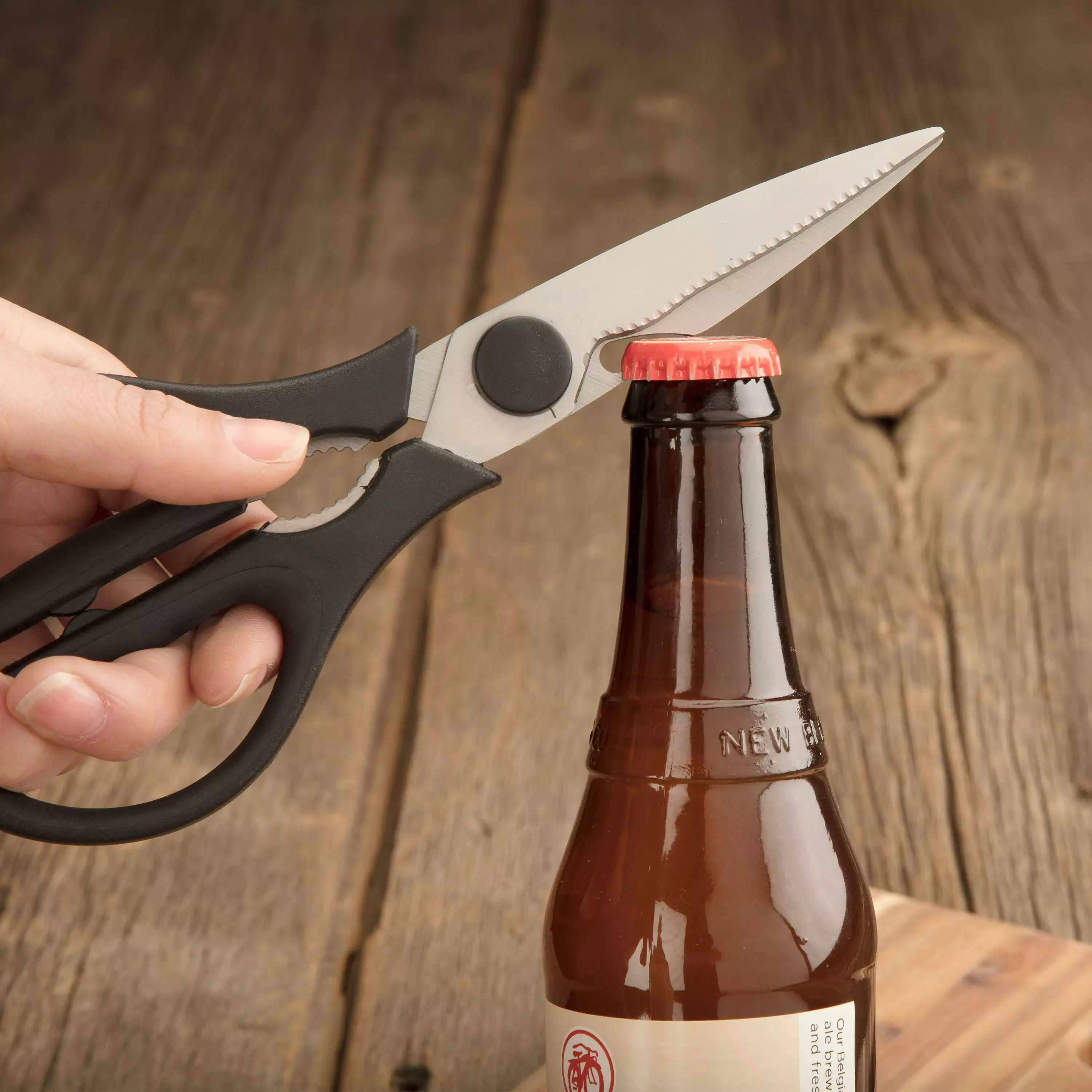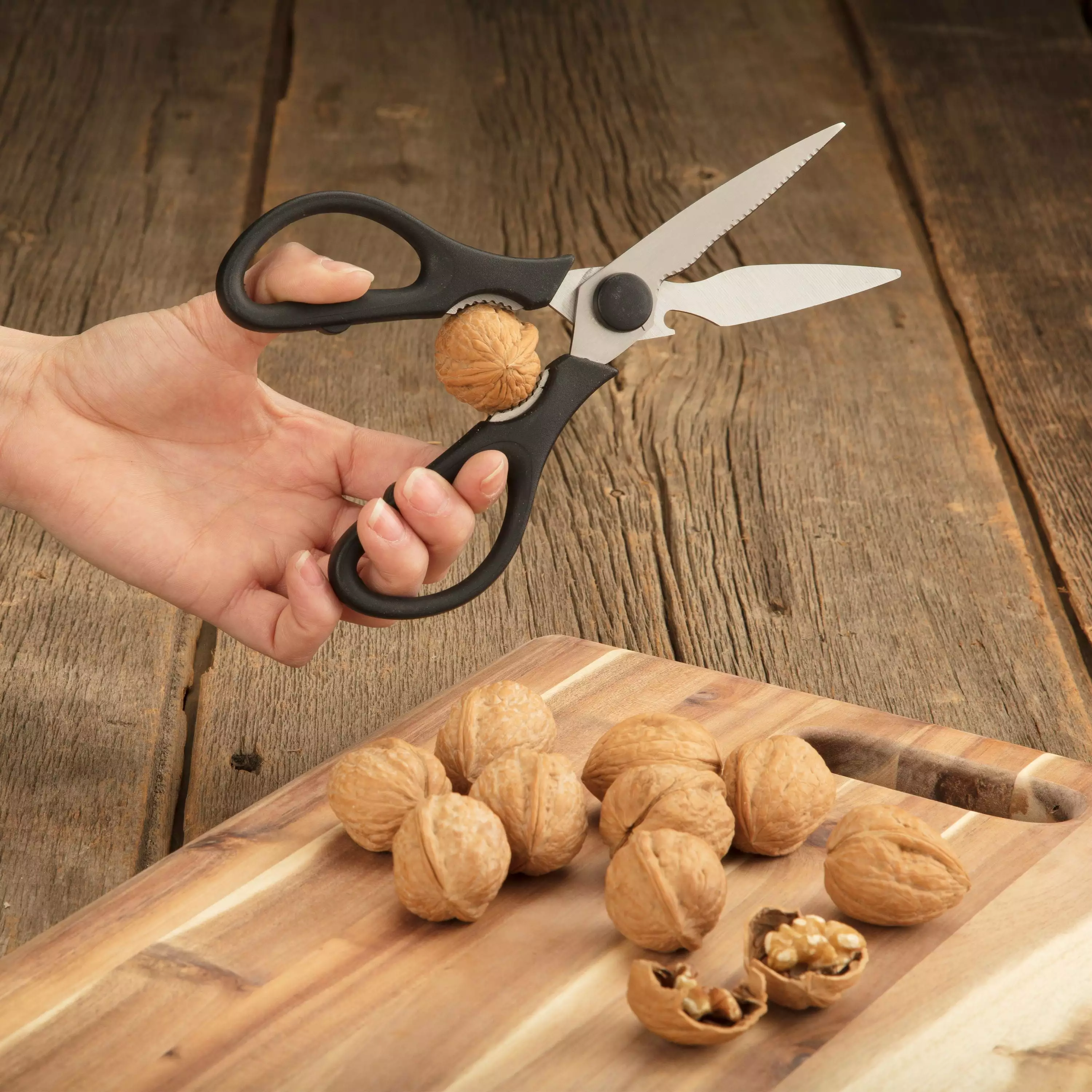 - MULTI-PURPOSE SHEARS: Along with the ability to cut through food. the shears include a fish scale scraper. a nut and seafood cracker and a bottle opener. The shears also lock together for added safety.