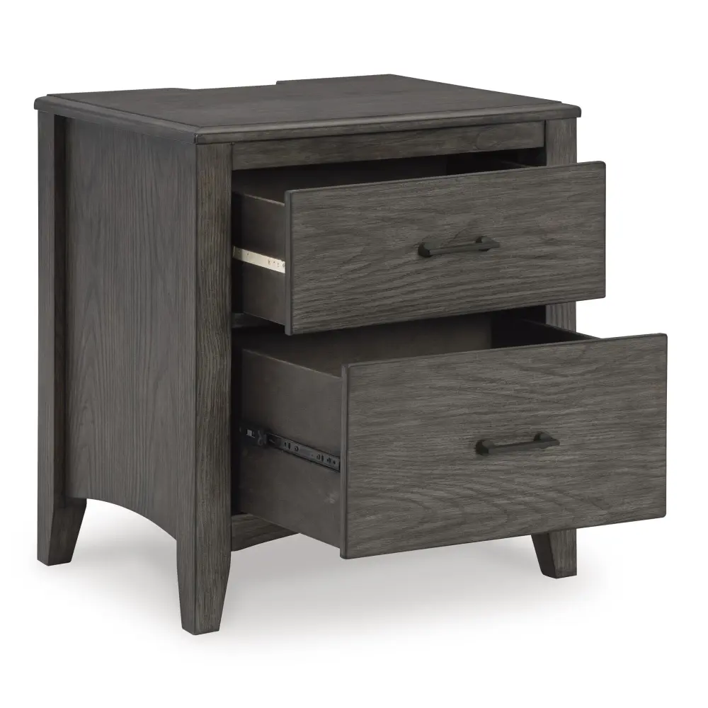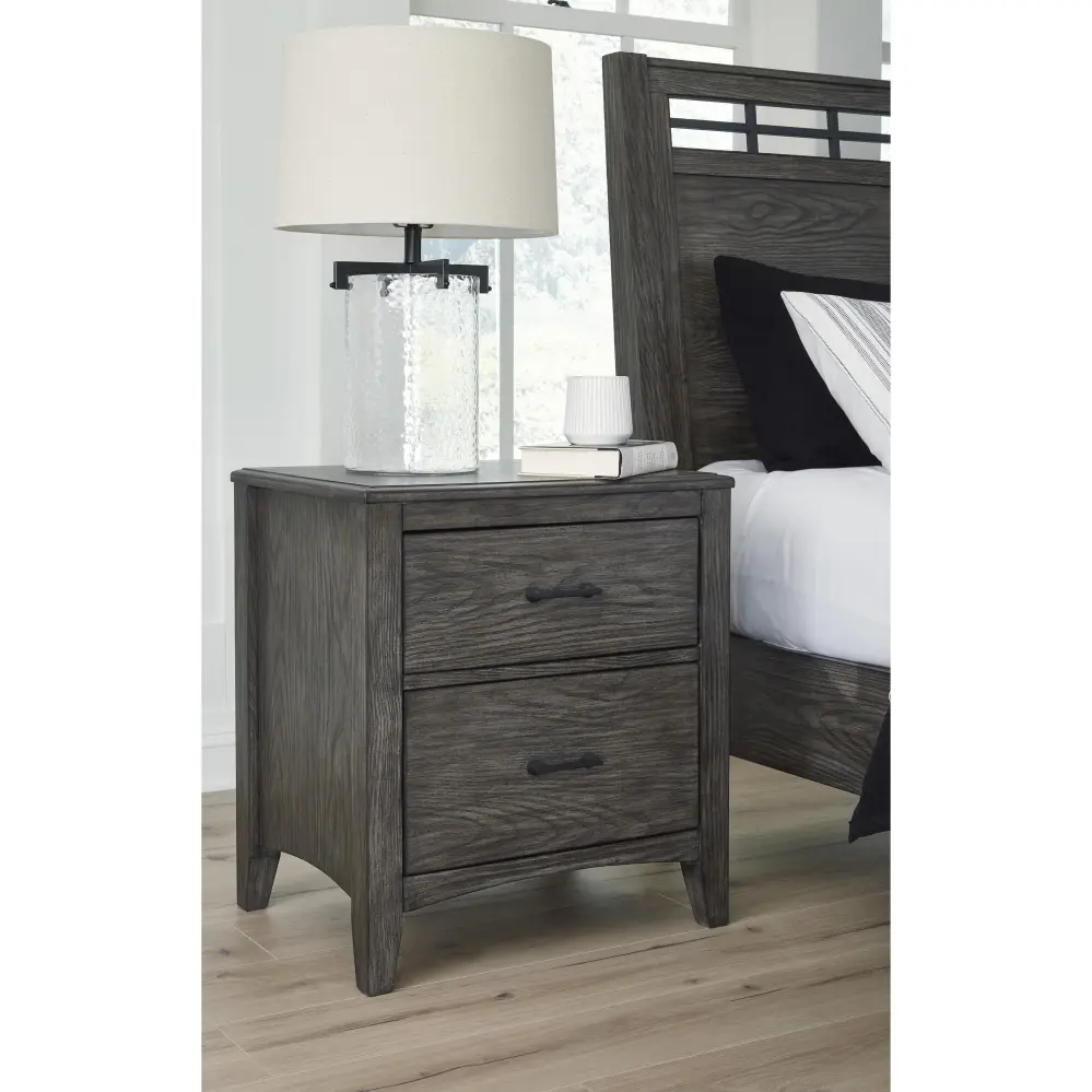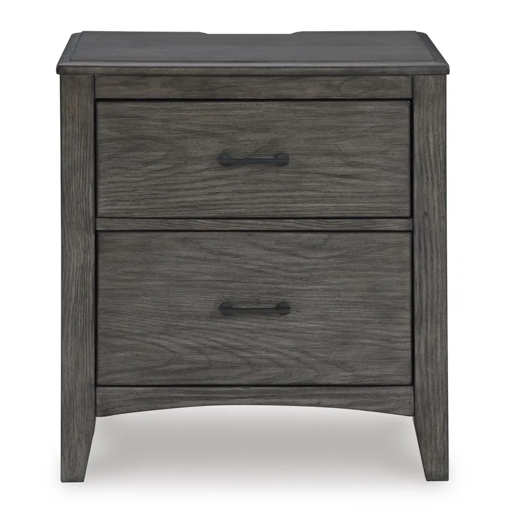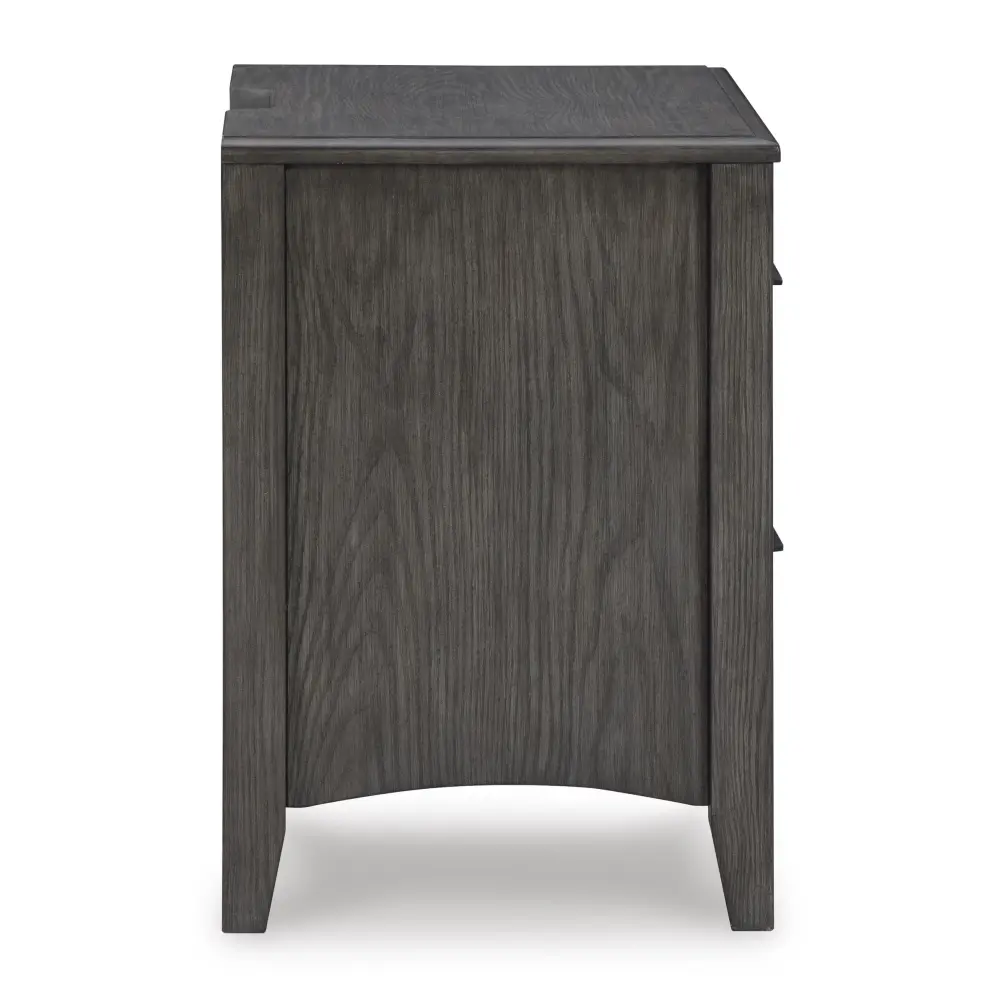 Cool and immaculate, yet warm and inviting. This nightstand has so many standout qualities, making it an inspired choice for your dream destination. A prime example of “casual contemporary” style at its very best, this designer piece is dressed to impress with an embossed wood grain texture. The medium gray-brown finish with a blackened wood grain contrast is wonderfully easy on the eyes. Spacious drawers with fully finished interiors offer ample storage for your bedside must-haves. And with time-saving USB charging ports, cell phones or laptops can be powered up without having to get up.