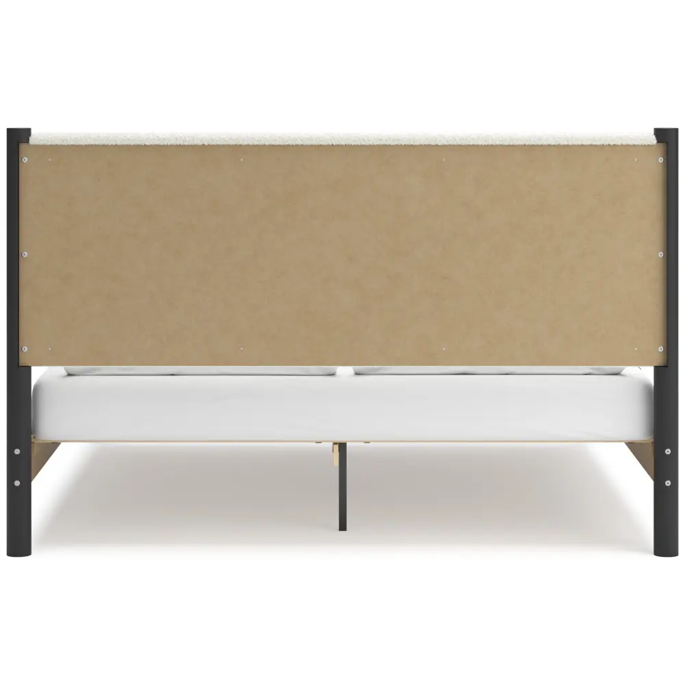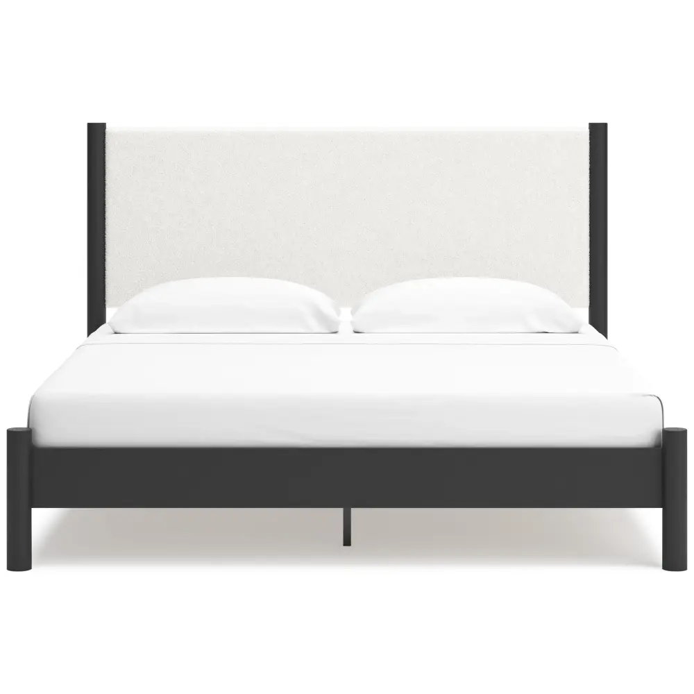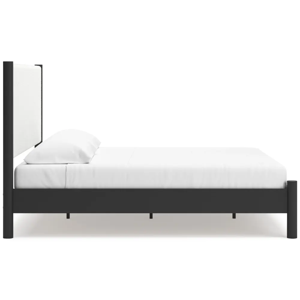 This king upholstered panel bed reflects your sophisticated approach to boho style. Crafted with both form and function in mind, its fresh white fabric beautifully contrasts the satin black finish. The versatile design suits all-neutral spaces or blends with your favorite pops of color. It’s inviting, yet posh. Luxe, yet laid-back. With this bed, your free-spirited vibe meets modern design.