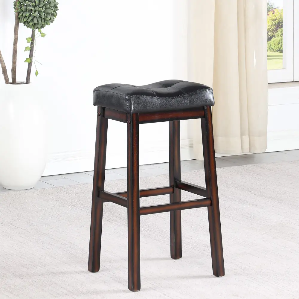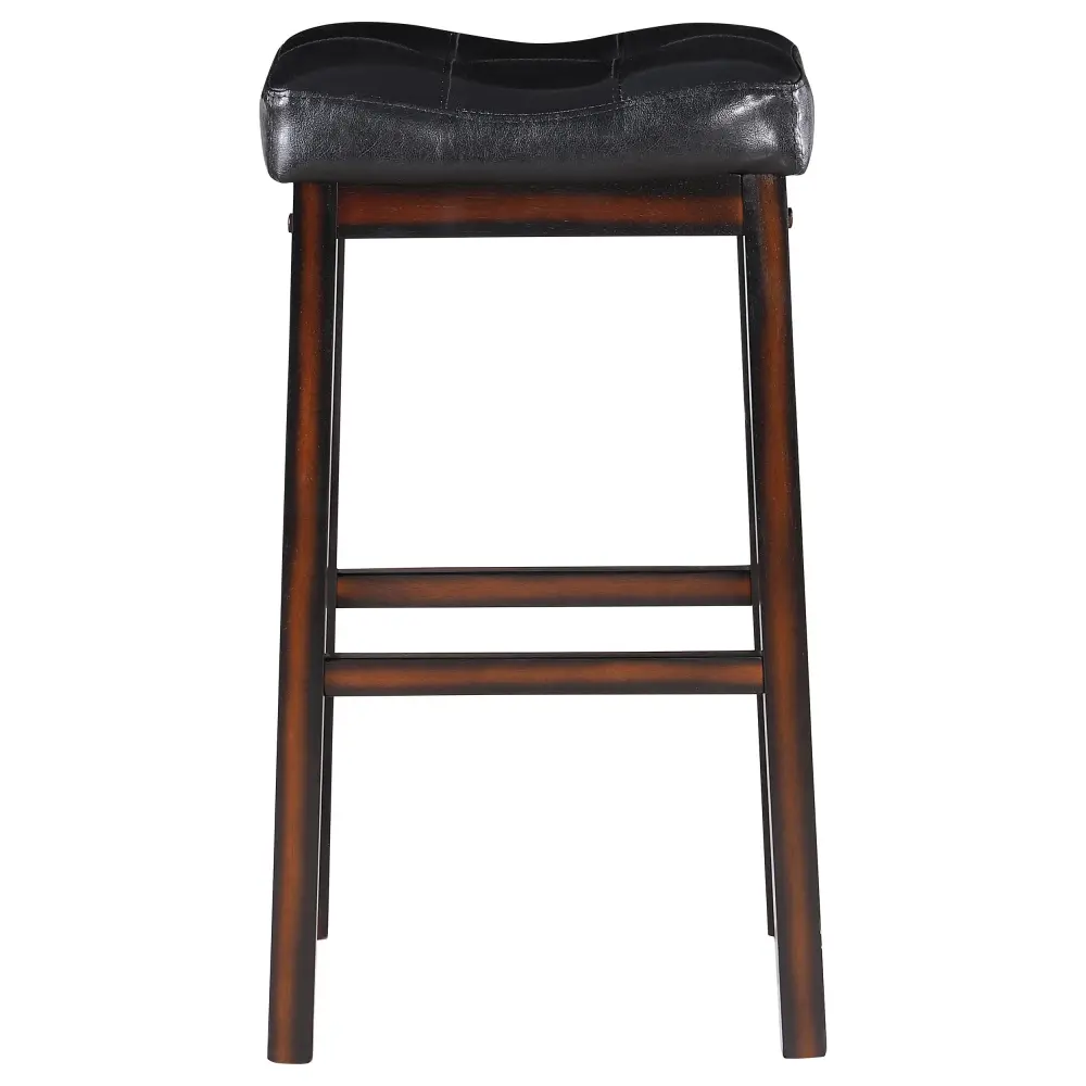 Bring refined style to a contemporary bar table with this plush wood barstool. At the perfect height for relaxation, the stool features a backless and armless silhouette. Its curved seat boasts black leatherette upholstery with tufting. Simple to maintain, this stool includes a wood base with angled legs and a rich cappuccino finish. Built-in footrests complement either side of the barstool, perfect for a relaxed evening or catching up on the news of the day.