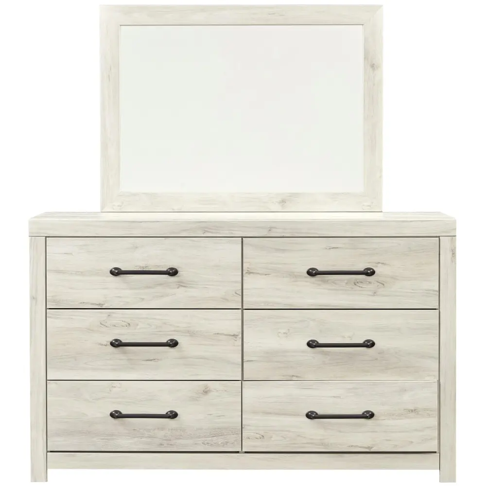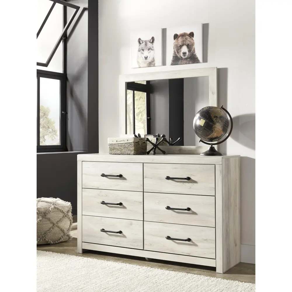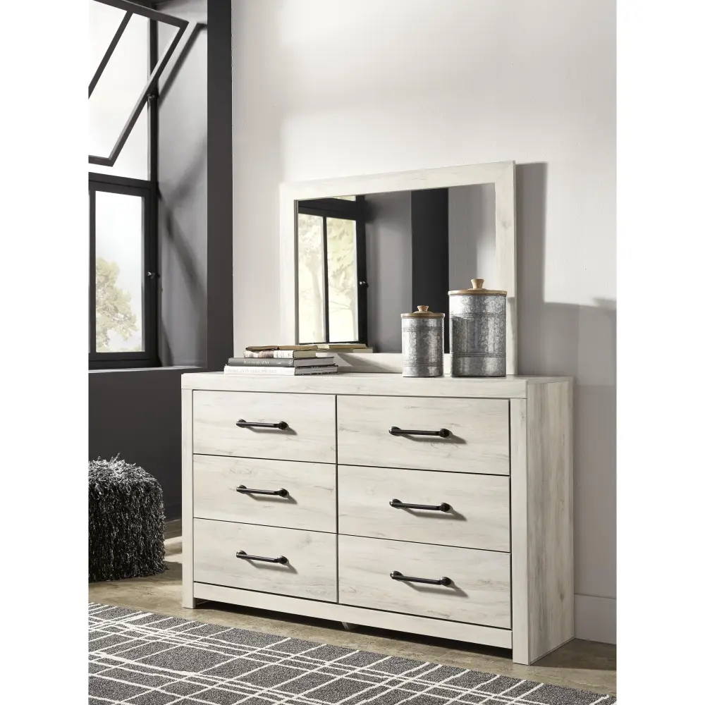 What a delightful take on rustic industrial style. Whether modern loft or modern farmhouse, this dresser and mirror arrange makes itself at home. The wispy whitewash palette enhances without covering the grain for that weathered look you crave. Elongated drawer pulls elevate the aesthetic.