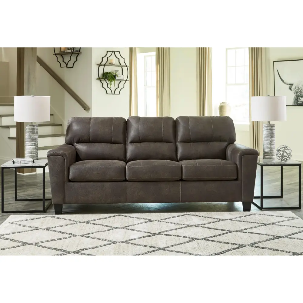 If you love the cool look of leather but long for the lukewarm feel of fabric, you can take comfort in this queen sofa sleeper. Wrapped in a fabulous faux leather with a weathered hue and hint of pebbly texture to resemble the real deal, this decidedly modern sofa proves less is more. Elements include angled side profiling and track armrests wrapped with a layer of pillowy softness for that little something extra. Prominent jumbo stitching and clean-lined divided back styling lend fashion-forward flair. Rest assured, the queen memory foam mattress comfortably accommodates overnight guests.