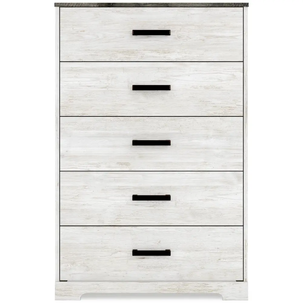 Give provincial a new meaning with the chic look of this chest of drawers. A dual-tone finish keeps this piece light and fresh, while the warm pewter-tone hardware adds an industrial touch. The distressed whitewashed body adds a delightfully homespun charm to your space.