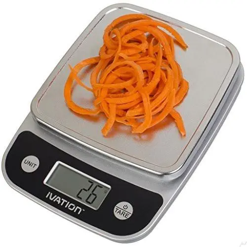 Weighs next to nothing. Weighs nearly everything.If the kitchen is your temple and food is your preferred form of art, you surely appreciate the importance of rationing as a critical element of cooking, baking and storing food. So choose this impressively lightweight Ivation kitchen scale, which makes it intuitive to weigh everything from a couple grams of herbs to a few pounds off a chunk of meat. A simple button on the front of the unit lets you select precise readings of ounces, milliliters and grams. Keep it handy around the kitchen, and you’ll find it to prove handy in endless situations. Best of all, the covered, easy-press buttons and sturdy one-piece plastic housing wipe easy for a speedy cleanup.Smart Tare Function for Accurate Net Weight When using a container etc. to weigh another obj