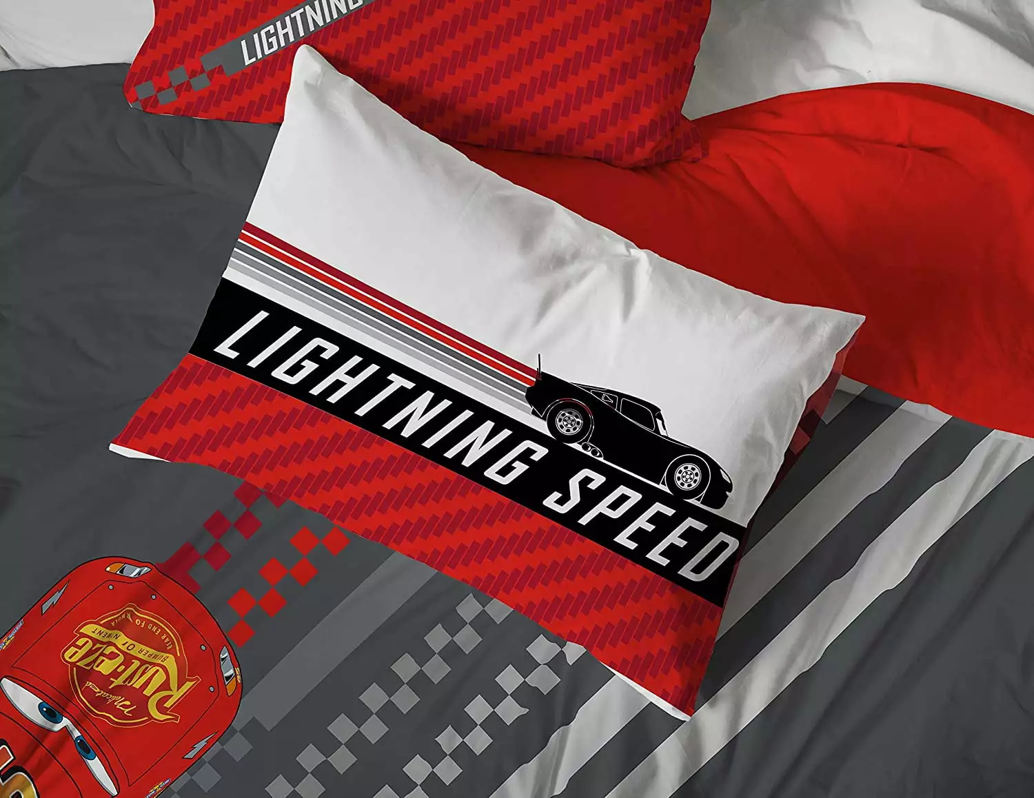- Grey and red bed set is printed with Disney Car’s racing legend. Lightning McQueen