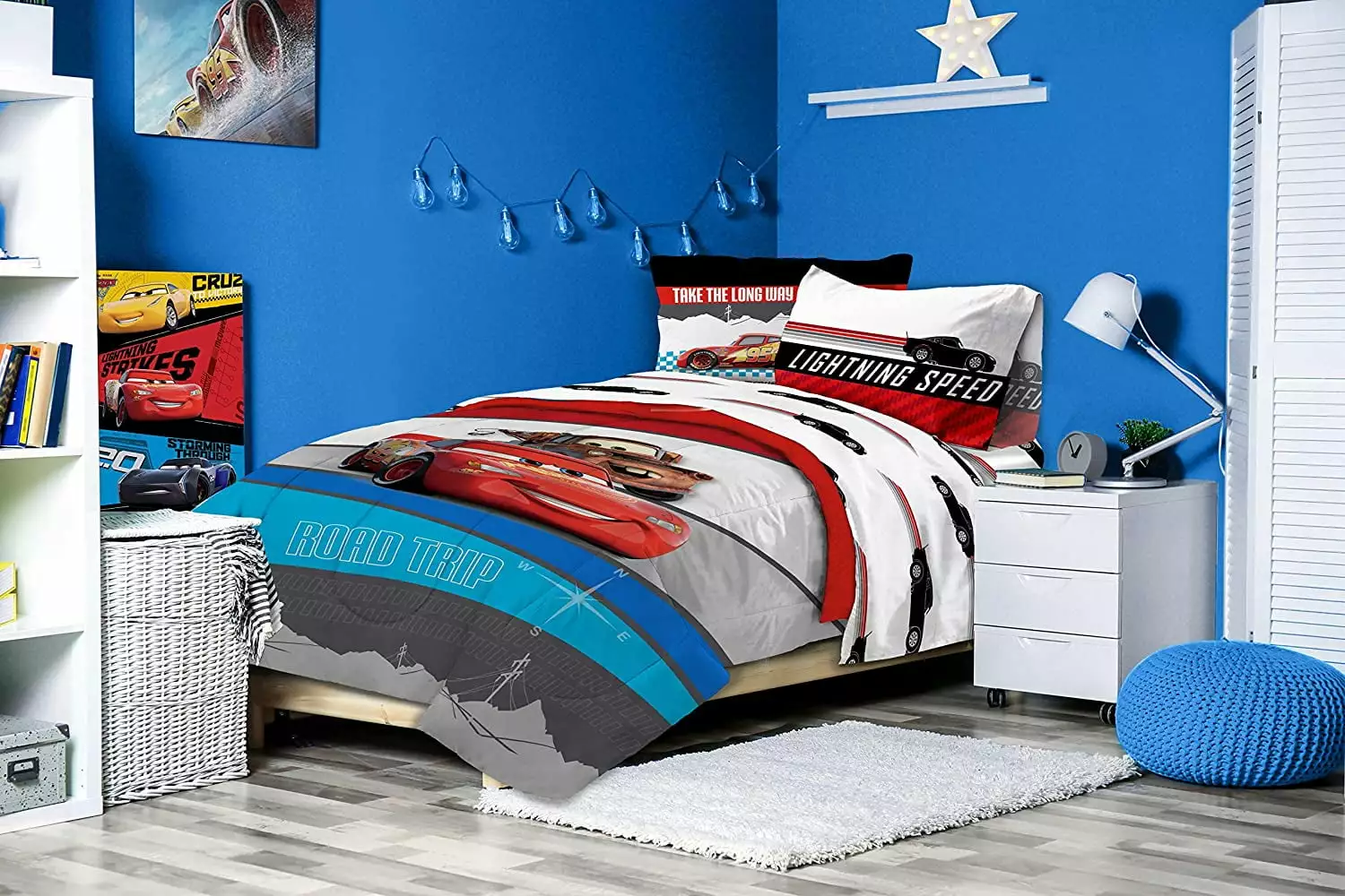 - Blue. red. and white bed set is printed with the Disney Cars’ racing legend. Lightning McQueen