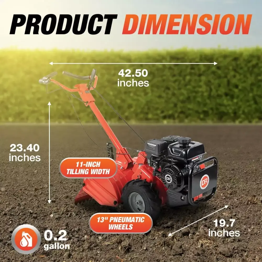 Unleash the power of the DR 11-Inch Rear Tine Tiller with OHV Engine and Counter-Rotating Tines. a robust solution for conquering your soil preparation challenges with ease. With its 208cc OHV engine delivering an impressive 9 foot-pounds of torque. this tiller makes sod-busting a breeze with its aggressive counter-rotating tines. Equipped with tines that rotate in opposition to the wheels. this tiller covers a generous 11-inch width. allowing for efficient soil cultivation. Dive deep into the earth with a maximum tilling depth of up to 11 inches. ensuring thorough preparation for your gardening endeavors. The 11-inch tines effortlessly break up compacted soil. creating an ideal environment for your plants to flourish. Maneuverability is key. and this tine tiller delivers 13-inch pneumatic wheels that provide traction and stability. The power-driven wheels can be easily released with a pin. allowing for free-wheeling when you need to transport or navigate the tiller with ease. Take command of your gardening domain and experience the efficiency of an OHV. 208cc. 8.86 FPT engine combined with the advantage of counter-rotating tines. Seize command of your soil preparation tasks with the DR 11-Inch Rear Tine Tiller. equipped with an OHV Engine and Counter-Rotating Tines C an intersection of strength and accuracy.