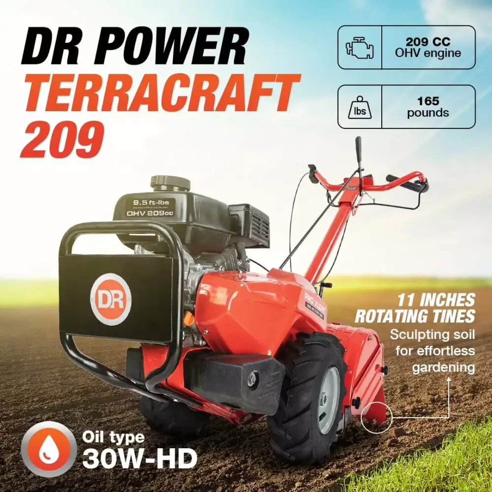 Transcends the ordinary to redefine your gardening experience with the DR Power TerraCraft 209. The 11-inch overhead valve (OHV) engine boasts a robust 209 cc. ready to conquer the soil with unrivaled efficiency. This dual-purpose tiller transforms seamlessly between a cultivator and a tiller. offering the flexibility your garden craves. Harnessing the might of its 9.5 FT/LB gross torque OHV engine. the TerraCraft 209 Rear Tine Tiller is a force to be reckoned with. Its dual 11-inch rotating tines effortlessly sculpt the soil. while the 18-inch tilling width ensures your garden beds are perfectly groomed. leaving no spot untouched. Go deep into your soil with the TerraCraft 209. reaching up to 11 inches for the ideal plant environment. The precision trees create an ideal canvas for your gardening dreams. With sturdy 13-inch by 5-inch wheels. this tiller effortlessly glides over your garden. striking the perfect balance between power and control for an unmatched gardening experience. In a world where cultivation meets innovation. the DR Power TerraCraft 209 stands as a testament to the harmonious blend of power. precision. and performance. Elevate your gardening game and embark on a journey of botanical bliss with the DR Power TerraCraft 209. where every till and turn transforms your garden into a masterpiece.