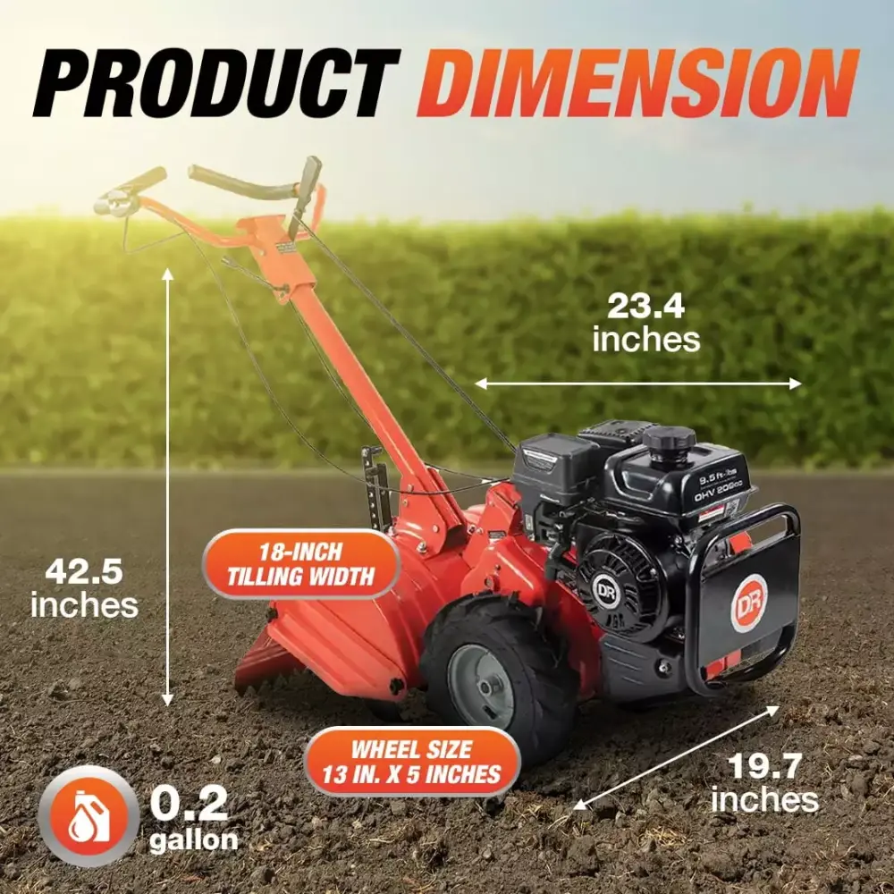 - Equipped with resilient 13-inch by 5-inch pneumatic wheels. the DR Power cultivator glides gracefully over your garden terrain. offering stability and maneuverability in one seamless experience