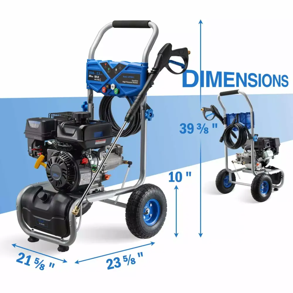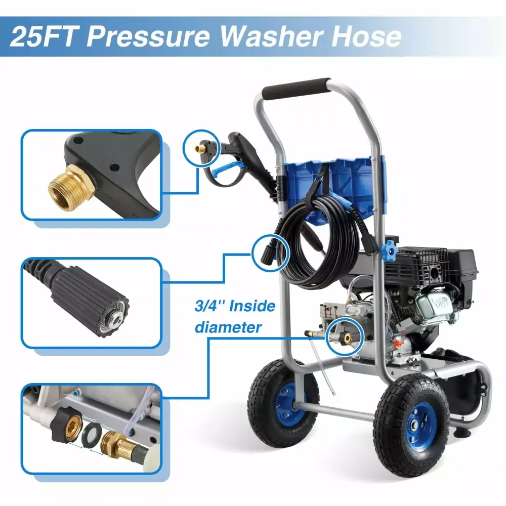 Efurden pressure washer provides an extremely powerful jet of water that can remove dirt and grime pretty easily. While there are electric models that can work well. gas engine pressure washers are often the most convenient to use. The 3500 PSI gas pressure washer with 2.3 GPM features 4 nozzles.11 inch tires. a 25-foot high-pressure rubber hose. and an axial aluminum pump. Powered by a RATO R210-S 209CC engine. this unit provides professional cleaning power in a practical design. Great for deck cleaning.cars cleaning. removing dirt buildup. loose paint. etc.