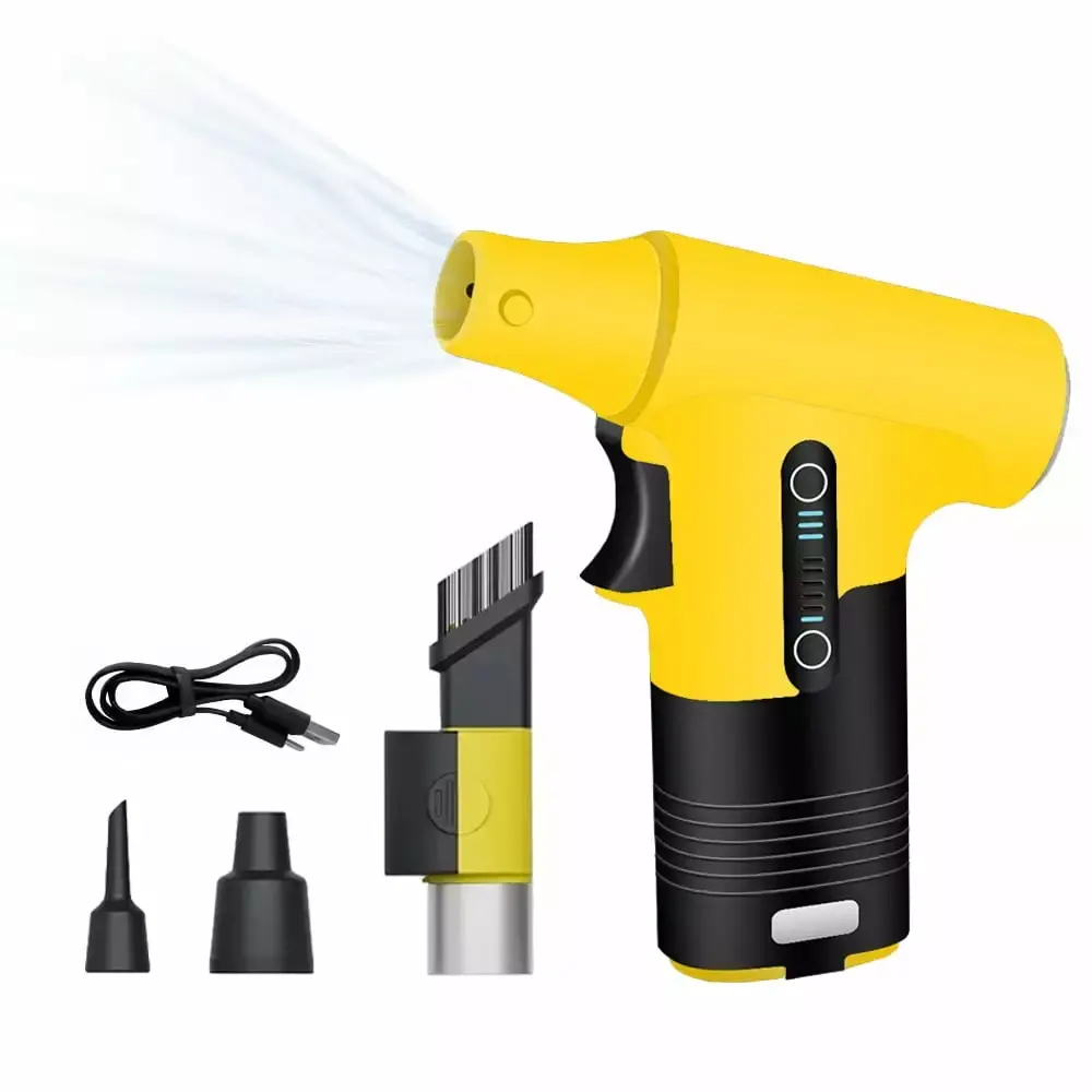 Electric Air Duster 130000RPM Mini Turbo Fan Blowing and Suction Dual-purpose Dust Removal Jet Dry Blower Portable Handheld Compressed Air Duster for Home Cars Computers Keyboards Built-in Rechargeable Battery With a built-in 3000mAh rechargeable battery. this fan offers a long battery for uninterrupted and efficient cleaning. It also features a washable filter net for efficient suction of fine particles. making it an environmentally friendly choice for your cleaning needs. This fan is small and lightweight. making it easy to carry around. It’s smaller than a mobile phone. so you can easily hold it in one hand and take it wherever you need it. This fan features an infinite variable speed control. allowing you to easily adjust wind with a simple press. This feature greatly enhances cleaning efficiency and makes fan easy and convenient to use. This fan is not just for cooling. It can also be used for cleaning various items and spaces. such as car consoles. computer keyboards. sofas. and even hair. It can also inflate air cushions quickly and garbage during picnics. With its blowing and suction switch. it’s a versatile tool for both indoor and use. This handheld wireless fan features a high-speed brushless turbo motor that can reach to 130.000 RPM. providing a strong wind speed of to 33M/S. With a motor of 40W. it offers powerful blowing and suction capabilities at of a button.