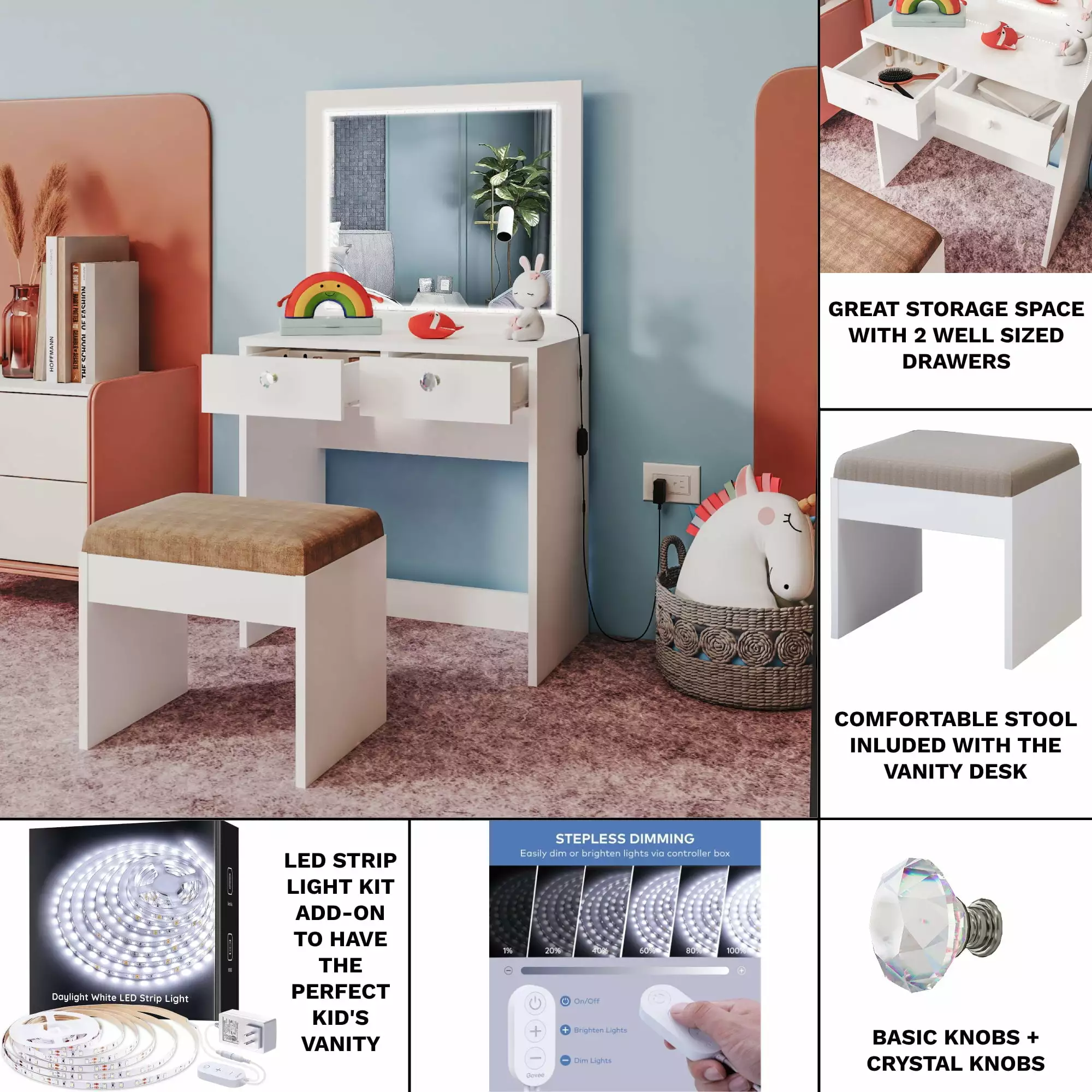 The Ember Interiors Lighted Vanity for girls is a delightful and practical furniture ensemble that will make your little girl feel like a star. Crafted from durable manufactured wood. this kids vanity boasts two generous drawers for storing accessories. a cozy stool. and a mirror adorned with LED lights. If you are looking for 5 year old girl birthday gift ideas. this kids vanity is the one. Plus this little girl vanity is easy to assemble. Measures 44.1” H x 24” W x 14” D
