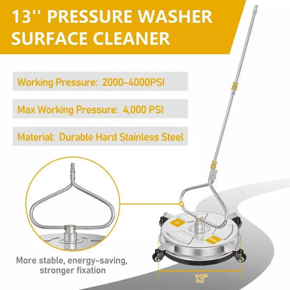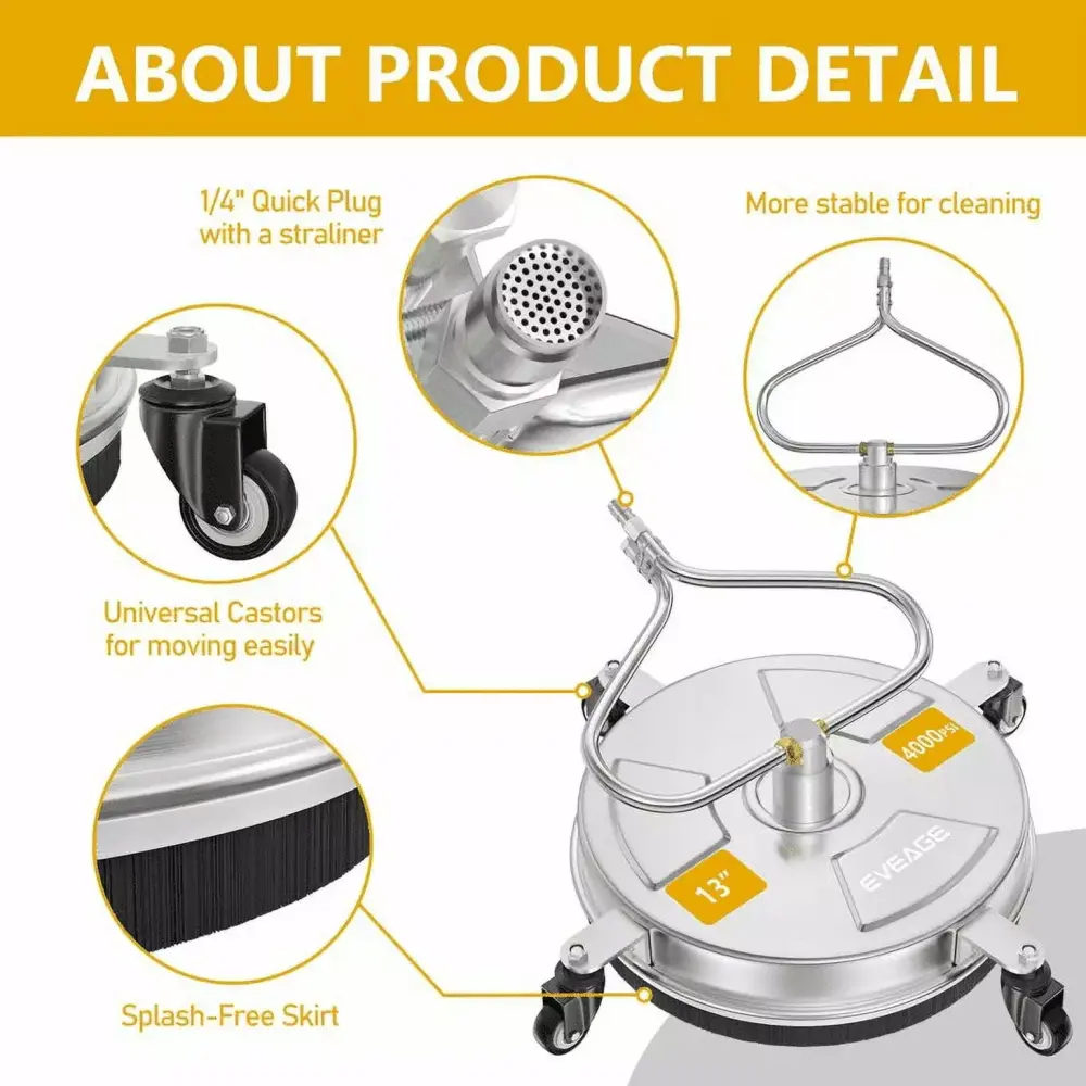 13 Inch Power Washer Surface Cleaner EVEAGE Power Washer Surface Cleaner is compatible with pressure washers up to 2000-4000 PSI. With a 13 cleaning range and powerful enough to remove stubborn stains from patios. driveways. decks and sidewalks.