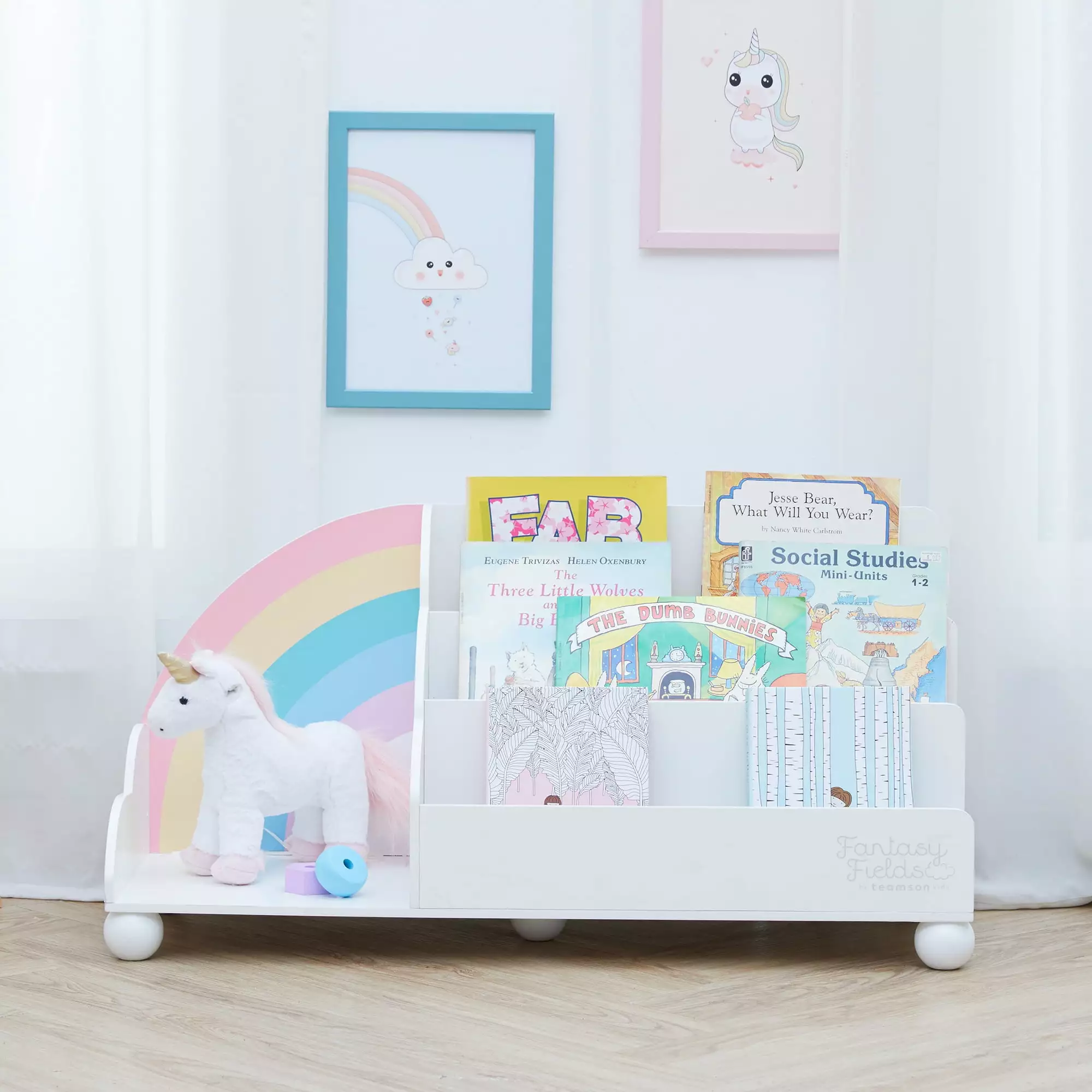 Fantasy Fields’ Rainbow Wooden Display Bookcase is a 3-tiered display with a white finish and rainbow design. Kids can find their favorite books on the staggered shelves with covers facing out. Includes a large storage space on the side for larger books. and a cubby area underneath the shelves for smaller items. Versatile. it can sit on bun-style feet on the floor for easy access for smaller readers. or used as a display on top of other shelves. counters. or tables in classrooms or libraries.