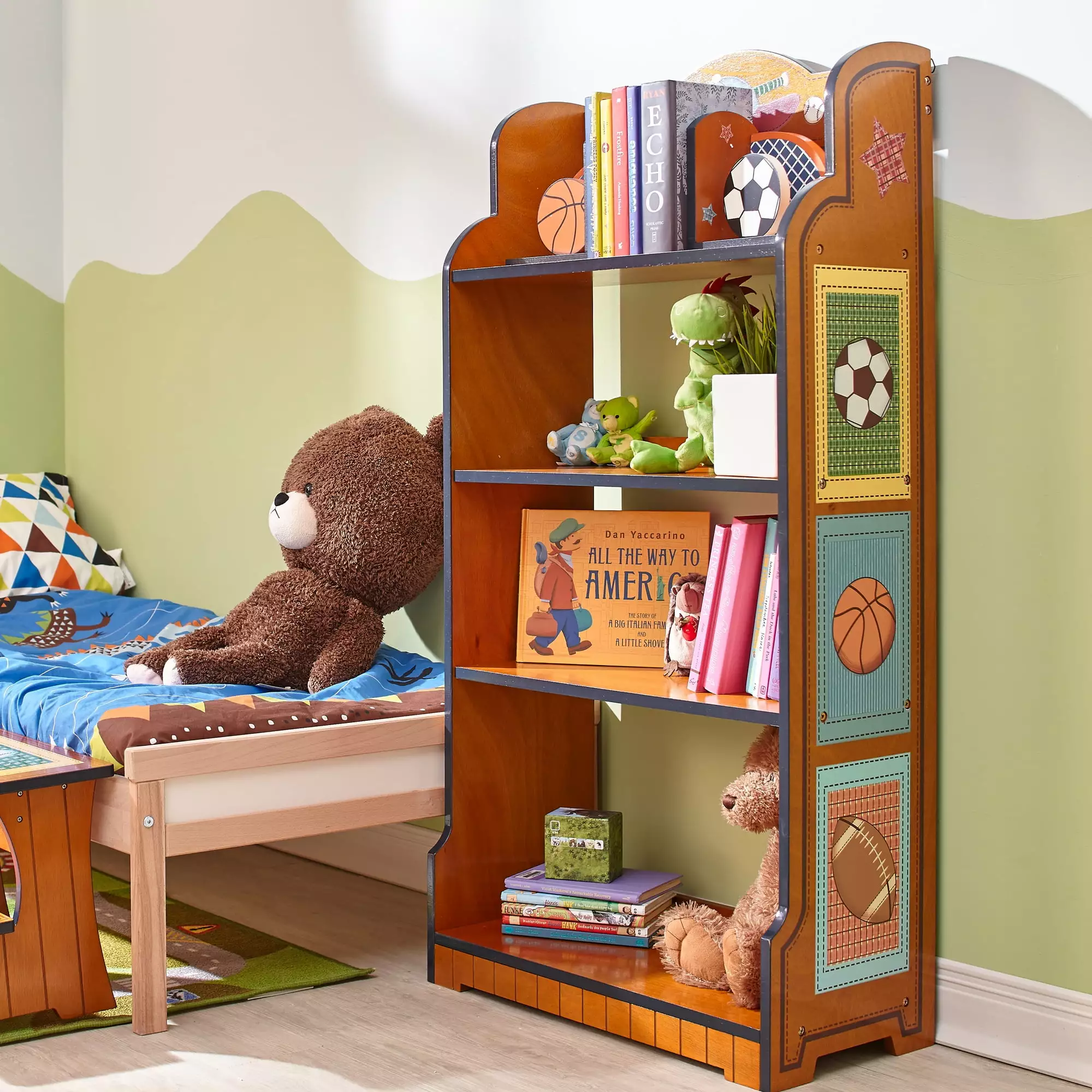 Fantasy Fields Little Sports Fan Kids 4-Tier Bookshelf features a warm. rich wood finish with quilt-style illustrations of a soccer ball. basketball. and football along the side panels and a baseball illustration on the top. Oversized shelves for larger items. like children’s picture books or easy access to toys. This durable and decorative piece is ideal for bedrooms and playrooms and is kid-sized with rounded edges and a wall mounting assembly for safety reasons.