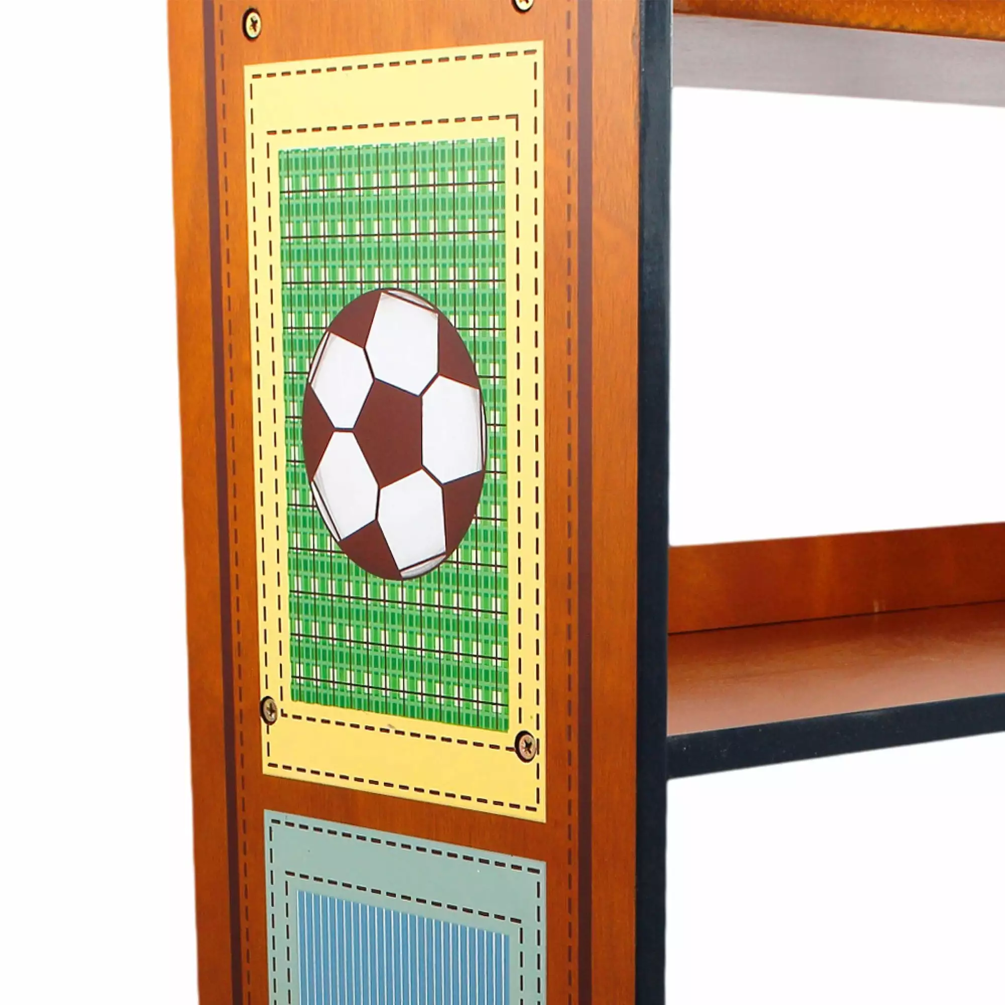 - Classic. warm wood finish with decorative quilt-panel illustrations of a football. basketball. soccer ball. and baseball equipment